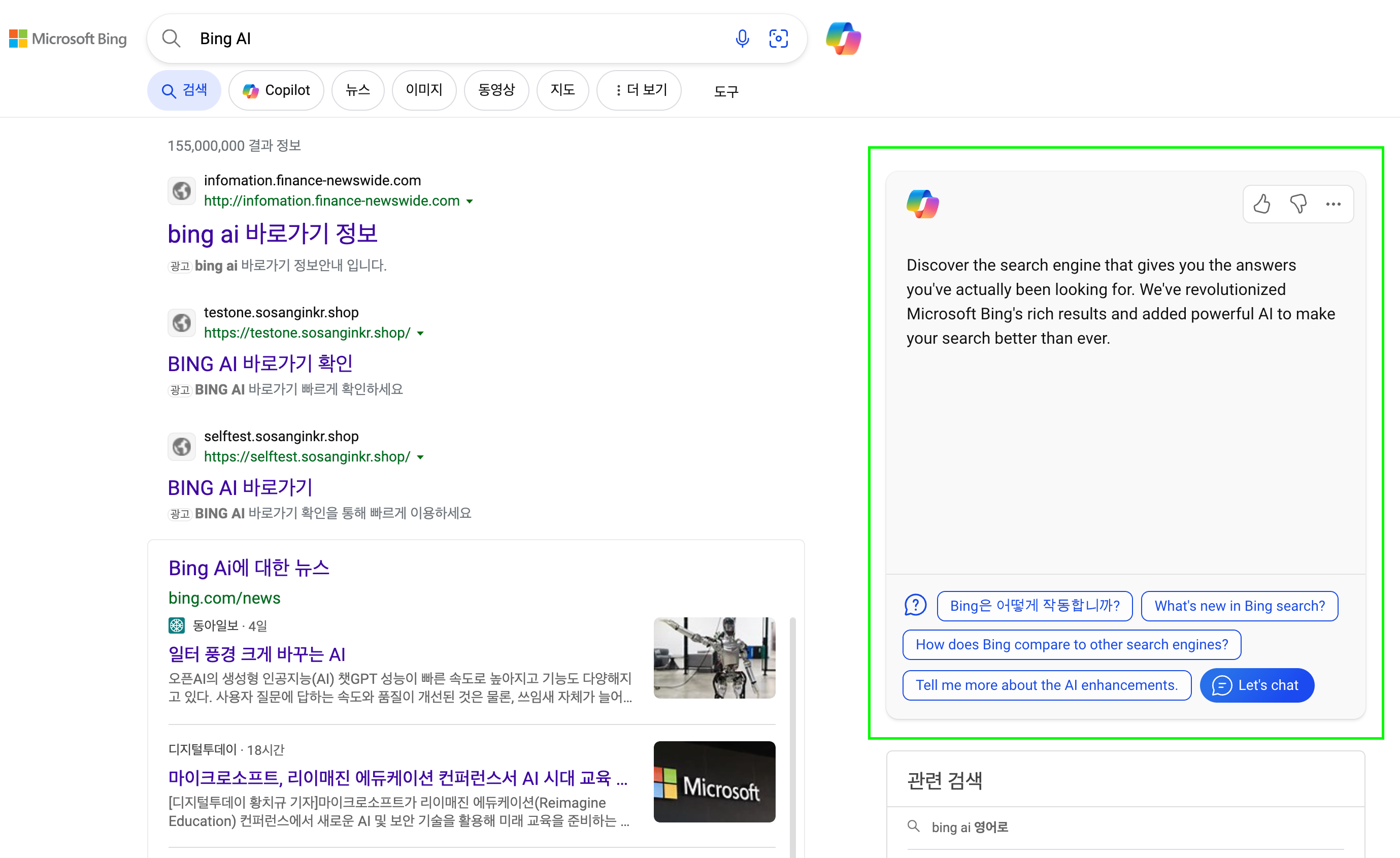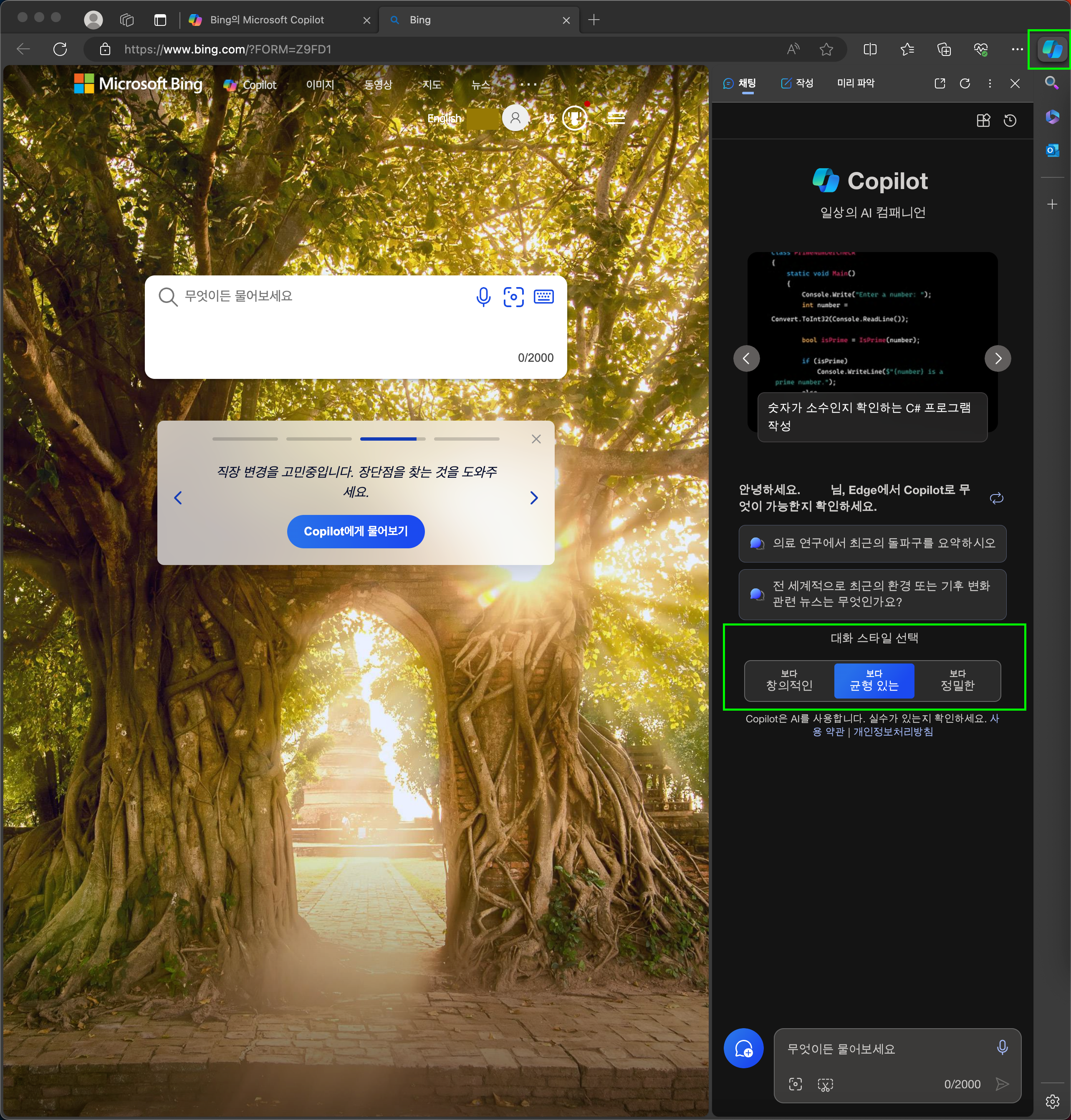 브라우저 창의 우측 사이드바에 코파일럿 아이콘을 클릭해 보시면, 더욱 디테일하게 검색할 수 있는 기능을 제공합니다.