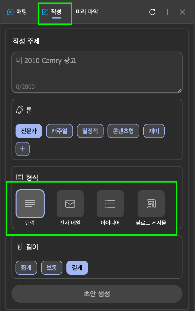작성 탭에 이동해보시면, 업무에 도움이 될 만한 문서 작성 및 이메일 작성에 필요한 지원을 받으실 수 있습니다.