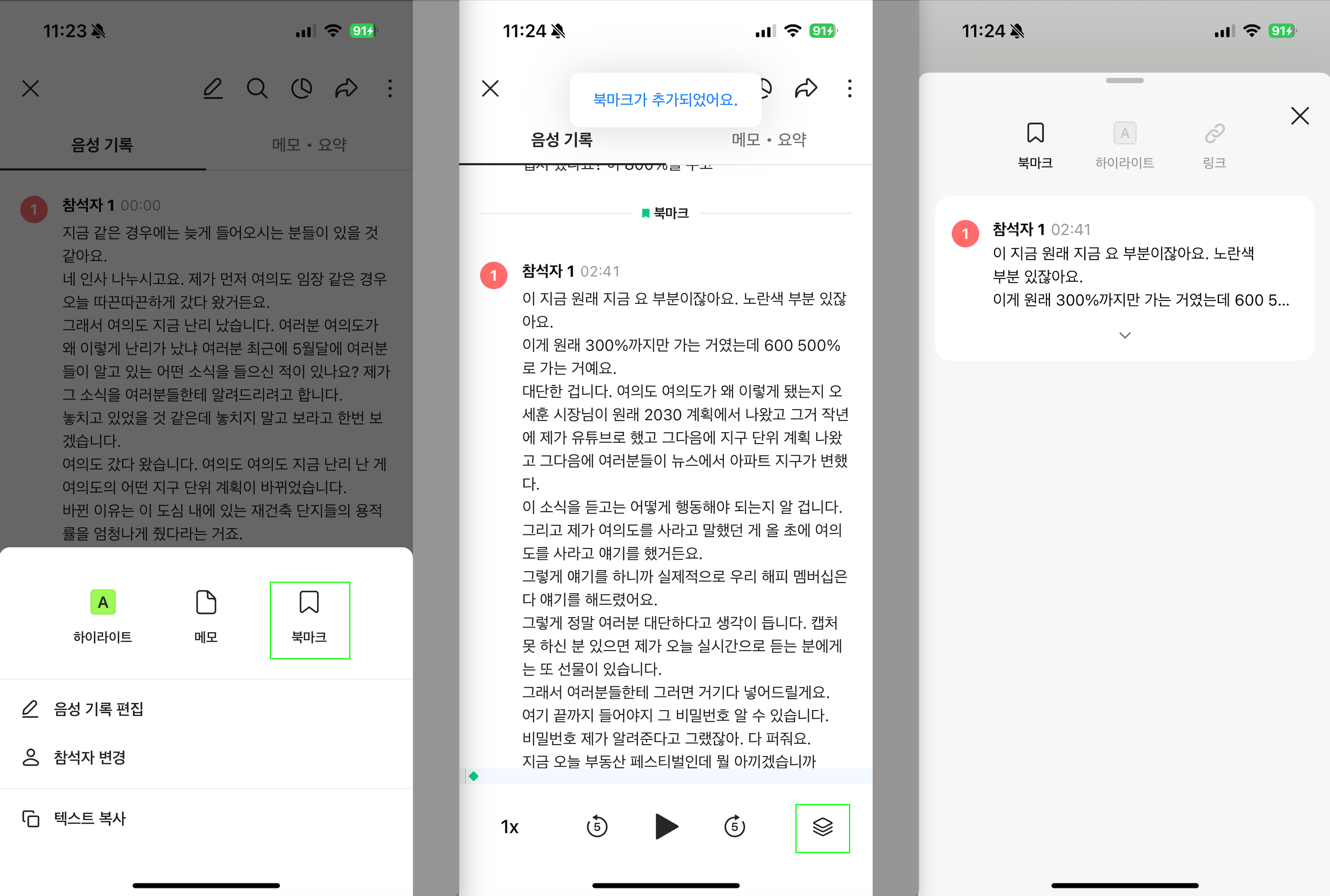 음성 기록 내용을 길게 탭 하면 북마크를 추가할 수 있는 창이 표시됩니다. 거기서 북마크 버튼을 탭 하여 북마크를 추가해 보세요.
