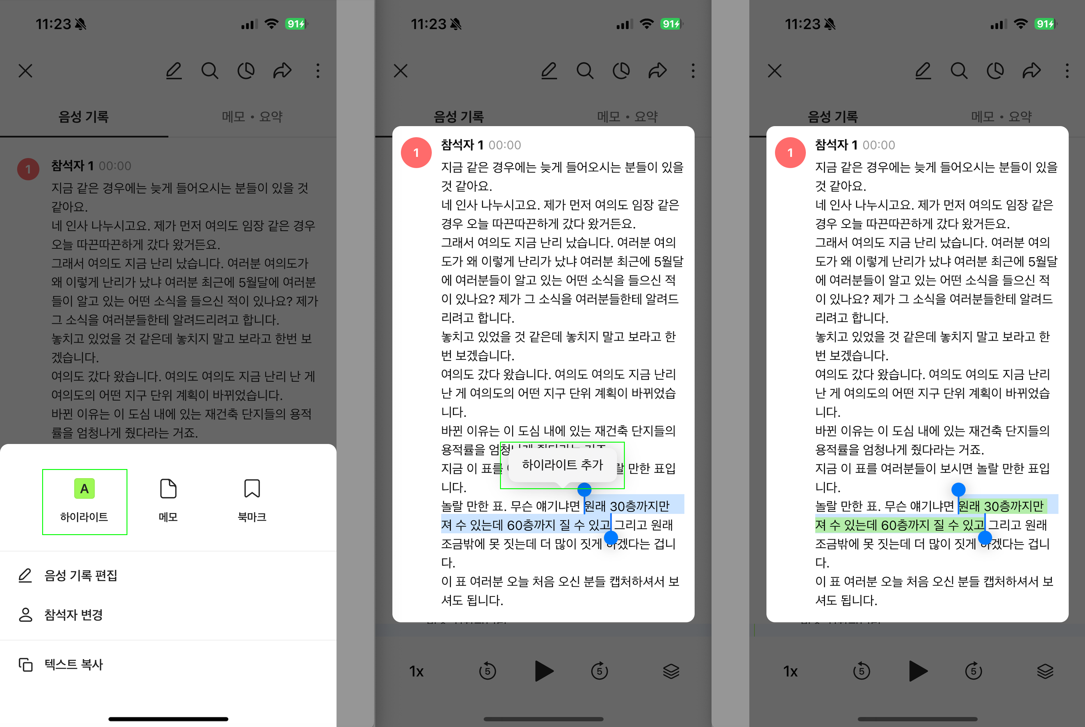 음성 기록 내용을 길게 탭 하면 하이라이트를 추가할 수 있는 창이 표시됩니다. 거기서 하이라이트 버튼을 탭 하면 원하는 부분을 선택하여 하이라이트 추가할 수 있습니다.