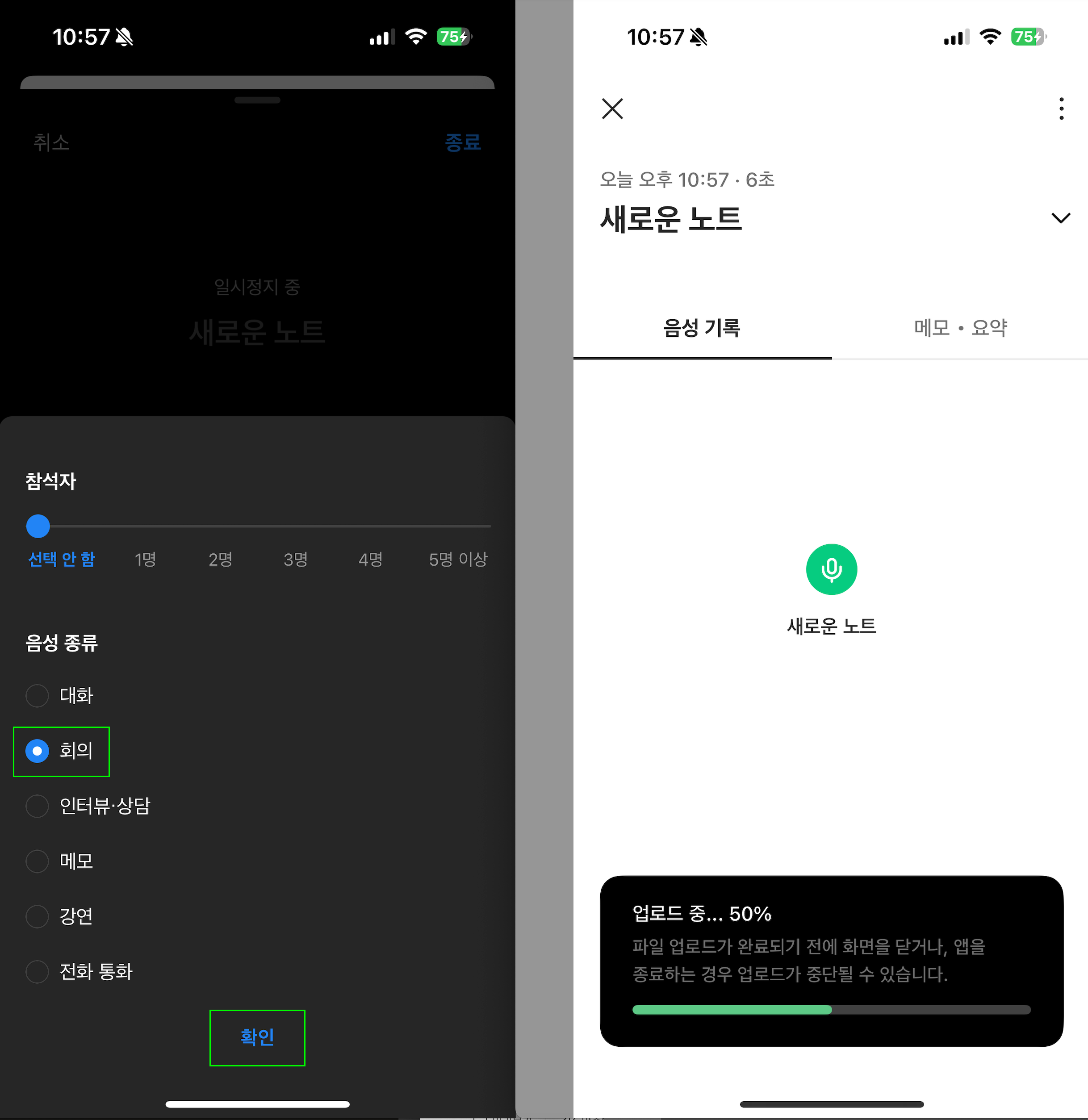 최종적으로 녹음 종료 버튼을 탭 하면 세부 정보를 설정할 수 있는 옵션 창이 나타납니다. 여기서 원하는 설정을 선택한 후 확인 버튼을 탭 하면, 음성이 텍스트로 변환되고 서버에 업로드됩니다.