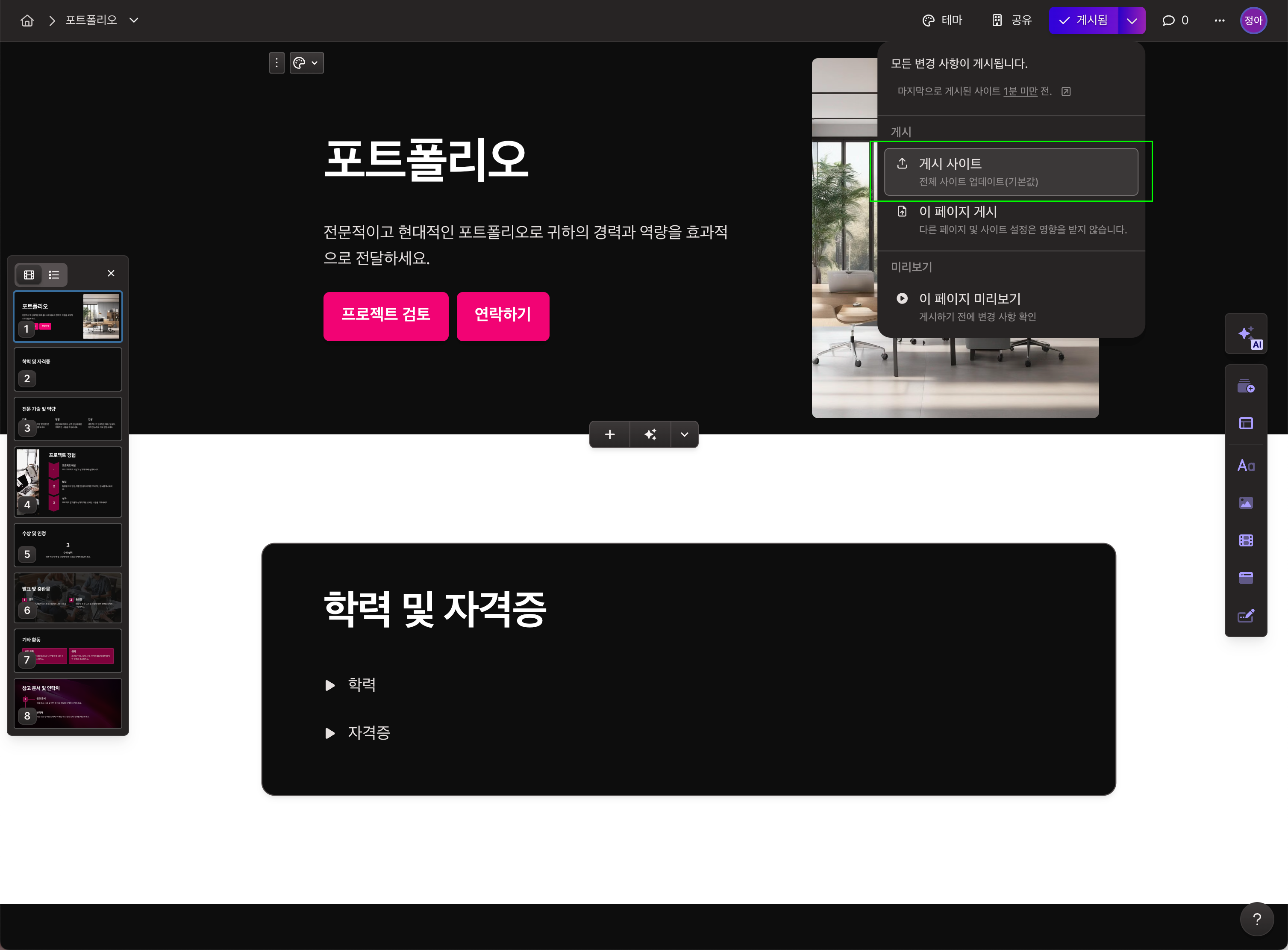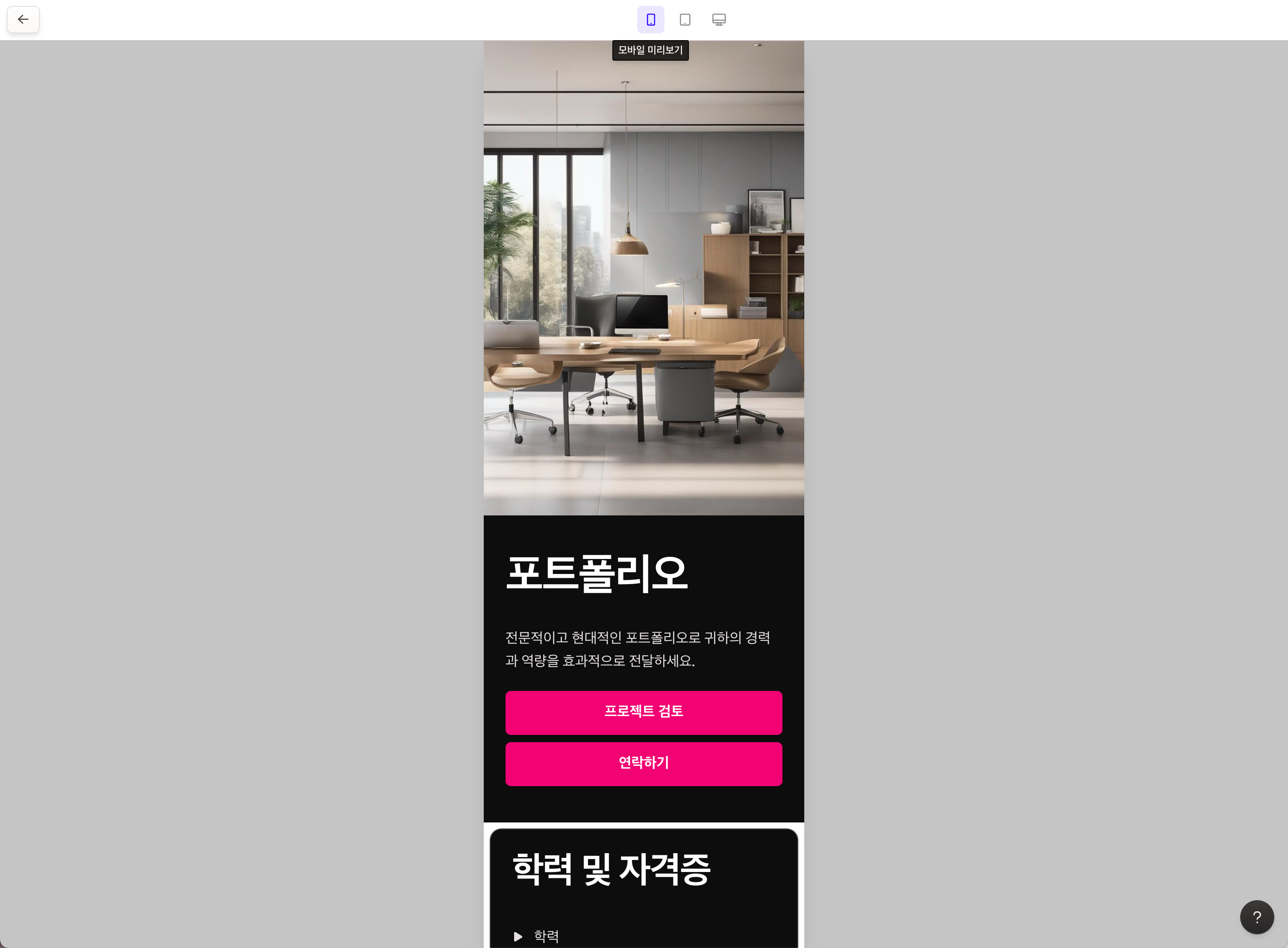 더욱 놀라운 점은 반응형 웹페이지로 제작해 준다는 것입니다. 이는 콘텐츠가 모바일(mobile), 태블릿(tablet), 데스크탑(PC)에서 모두 잘 보이도록 최적화되어 있다는 뜻입니다. 사용자는 미리보기를 통해 각각의 화면 크기에 맞게 콘텐츠가 어떻게 표시될지 확인하실 수 있습니다.