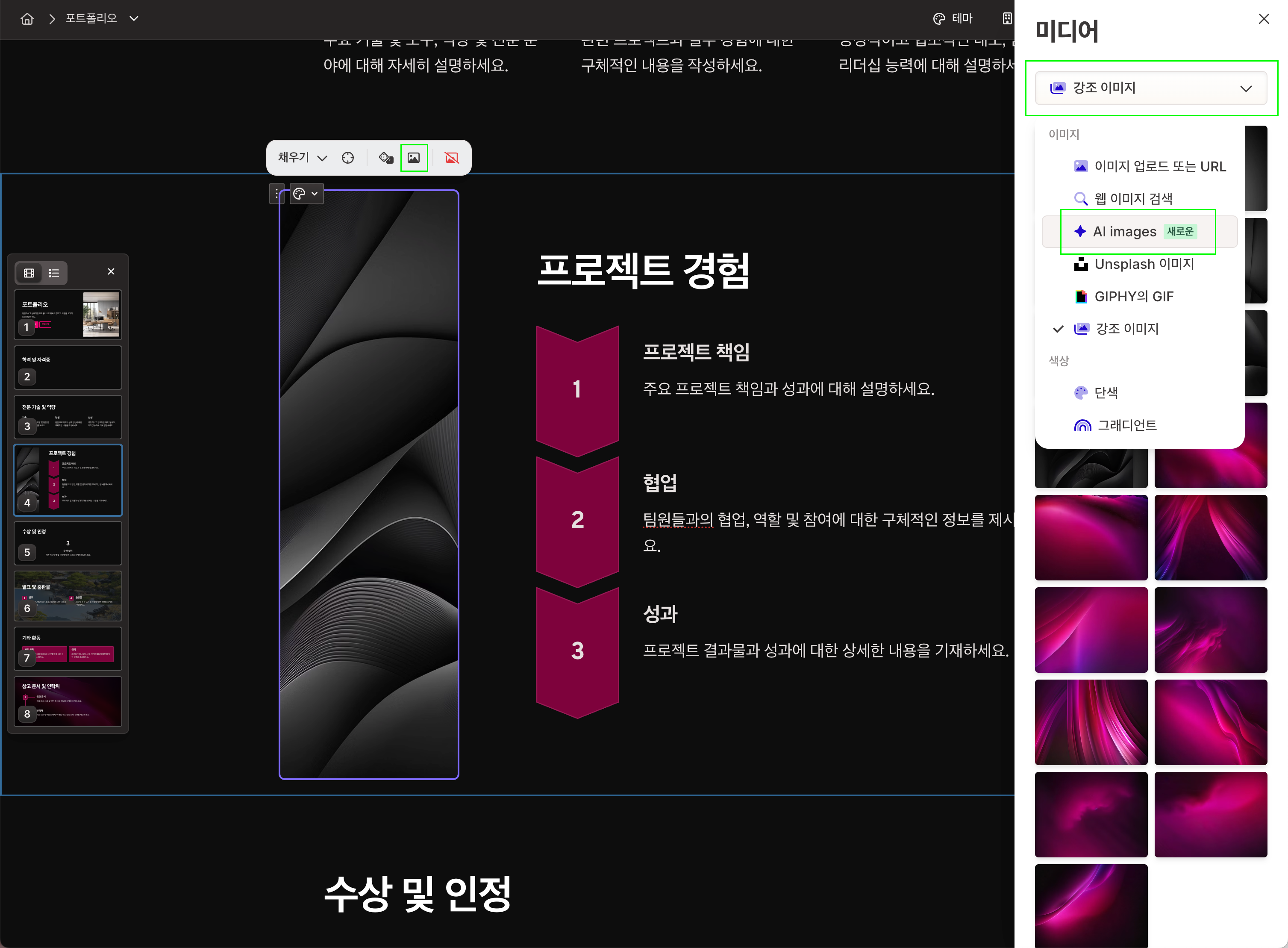 강조 이미지 아이콘 > 강조 이미지 드롭 메뉴 > AI images > 프롬프트를 작성 > 생성 버튼을 클릭합니다.