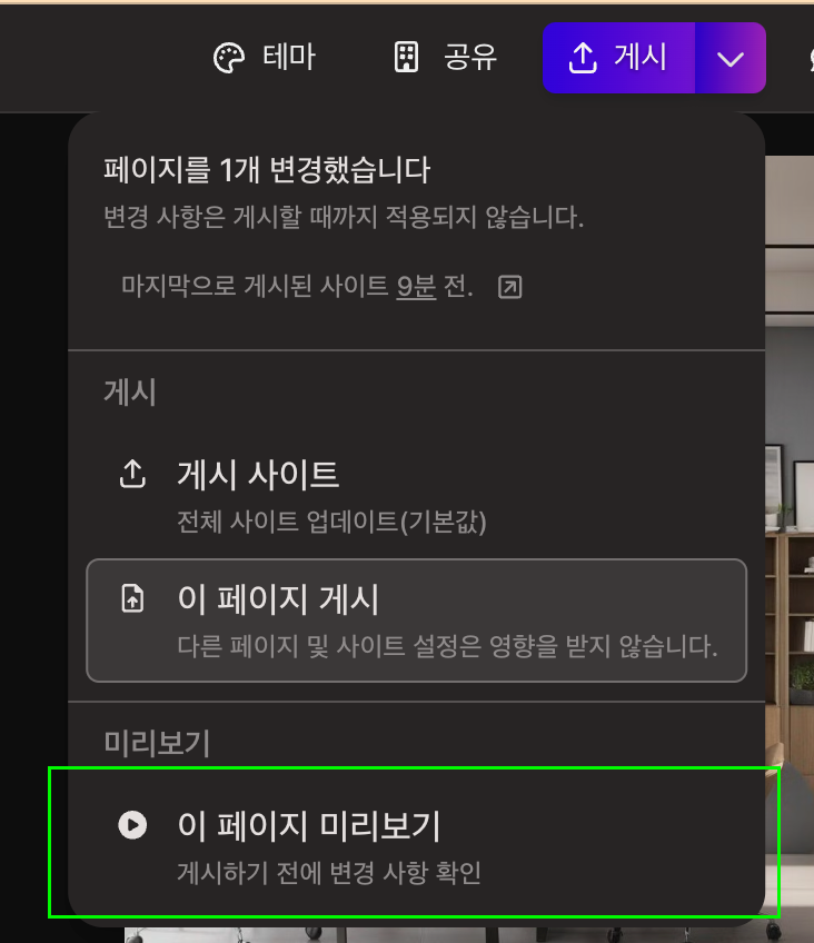 우측 상단 메뉴 > 게시 드롭 메뉴 > 이 페이지 미리보기를 클릭합니다.