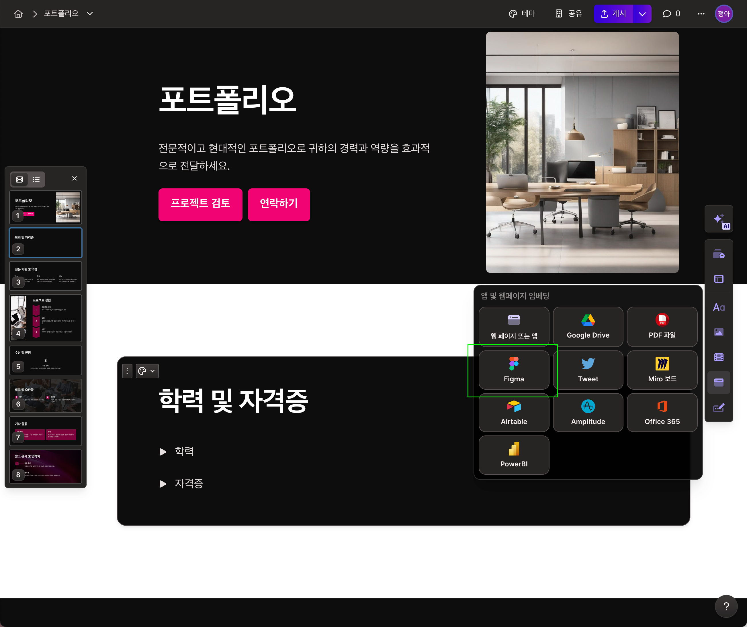 Google Drive, PDF, Figma, Tweet, Office 365 등 다양한 콘텐츠 유형들을 임베드(embed)하세요.