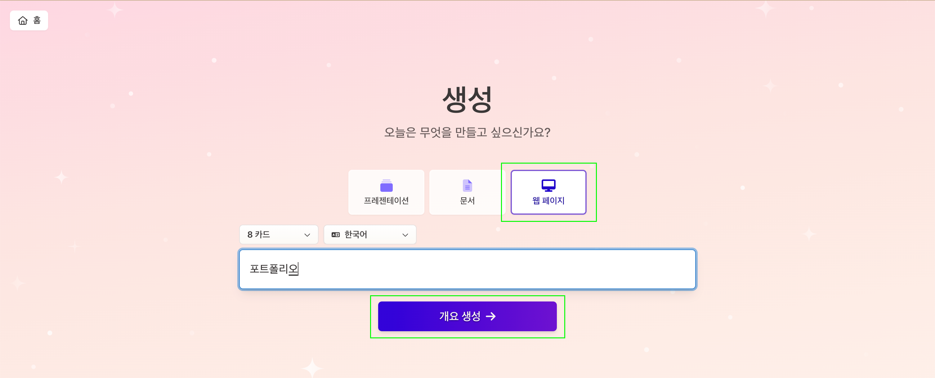 프레젠테이션(PPT), 문서(Document), 웹 페이지(Web page) 중에 목적에 맞는 옵션을 선택해 주세요. 저는 예시로 웹페이지를 선택했습니다. 어떤 종류의 웹사이트를 생성할지 정보를 입력하고 개요 생성 버튼을 클릭하세요.