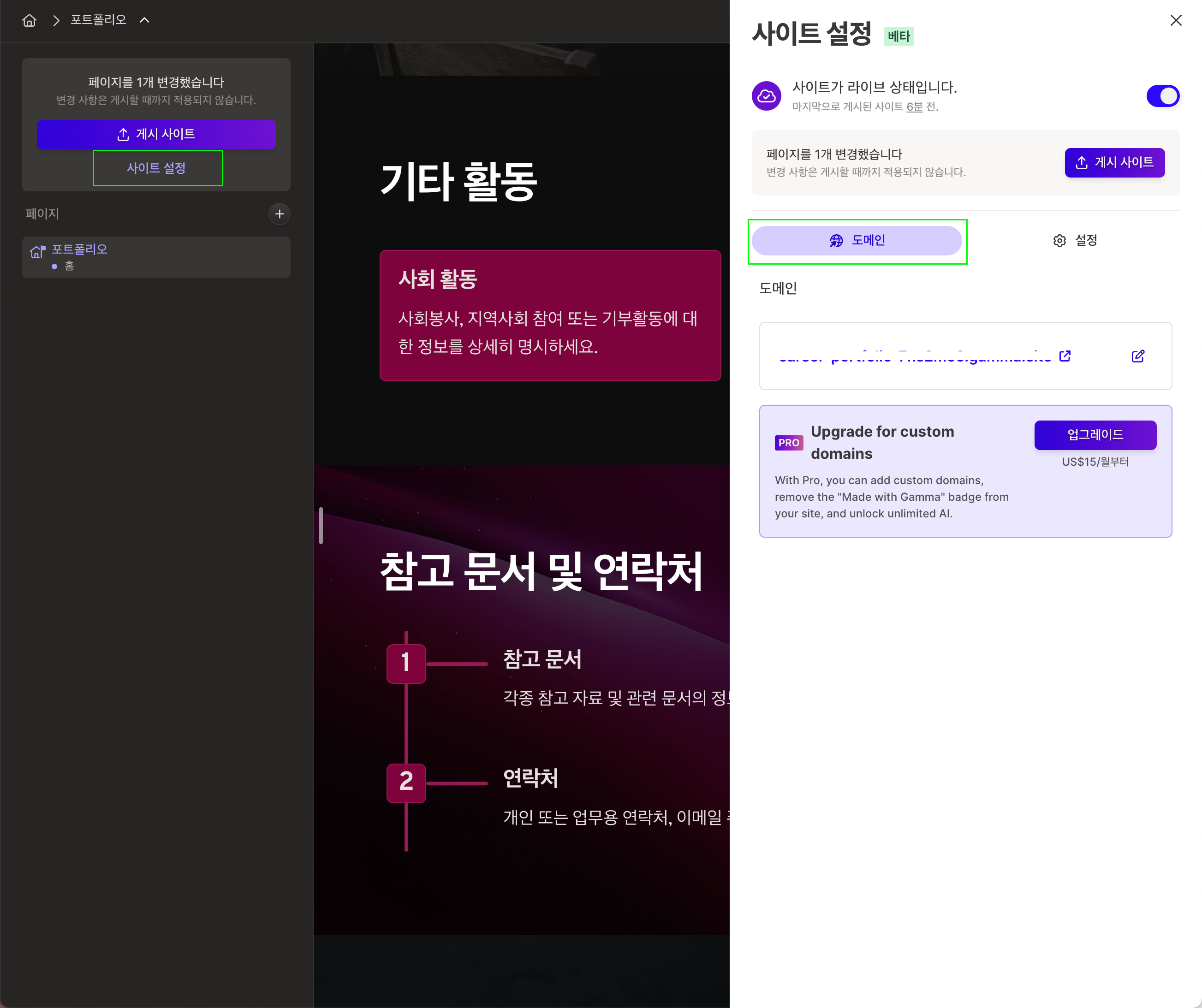 좌측 상단 메뉴 > 프로젝트명 드롭 메뉴 > 사이트 설정 > 도메인 탭 > 업그레이드를 클릭하세요.