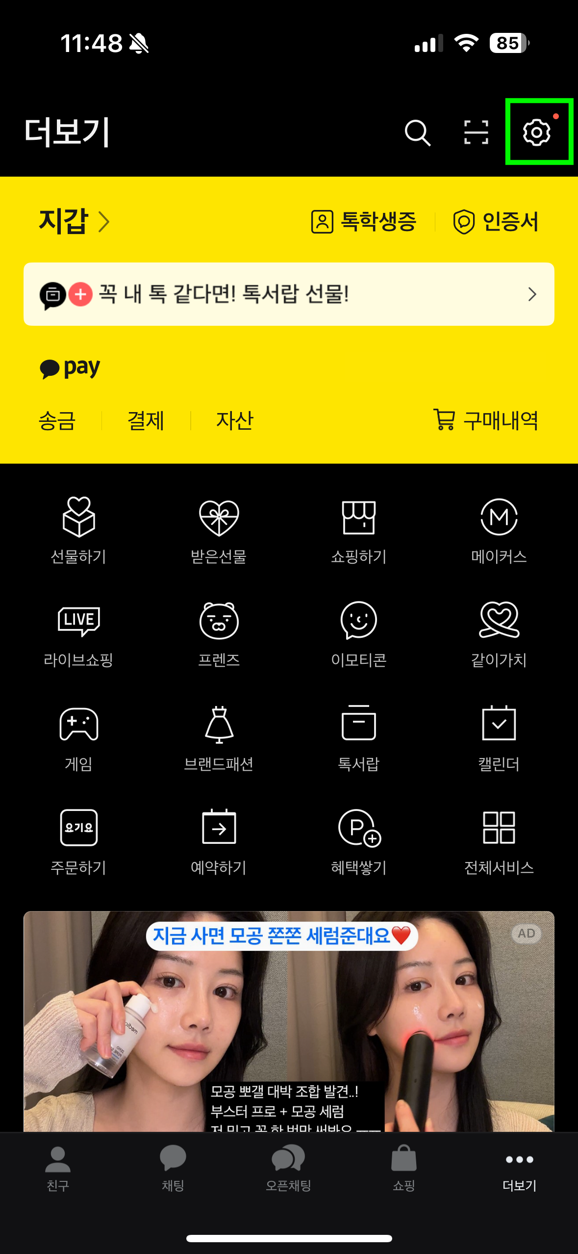 1. 카카오톡 설정 메뉴로 이동합니다.