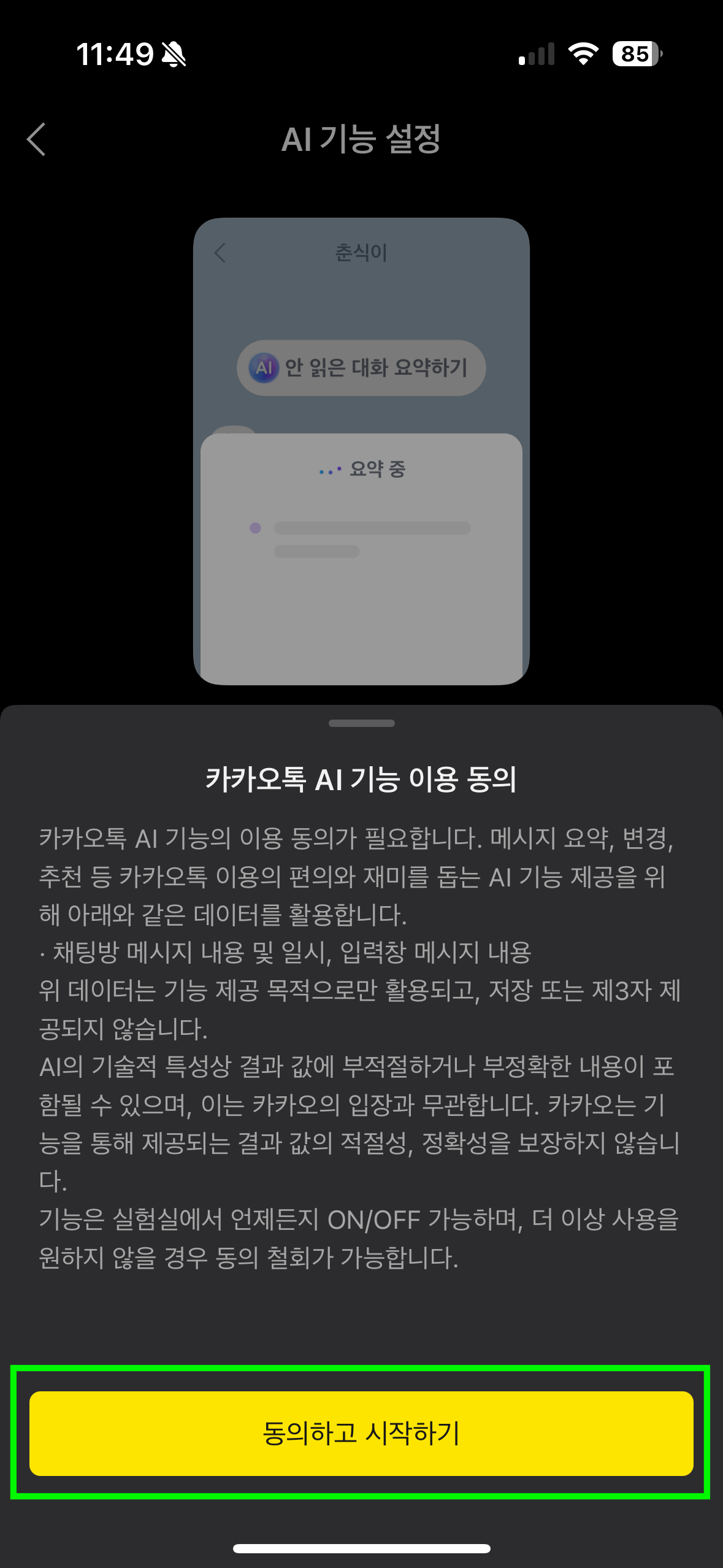 5. 카카오톡 AI 기능 이용 동의하고 시작하기 버튼을 선택합니다.