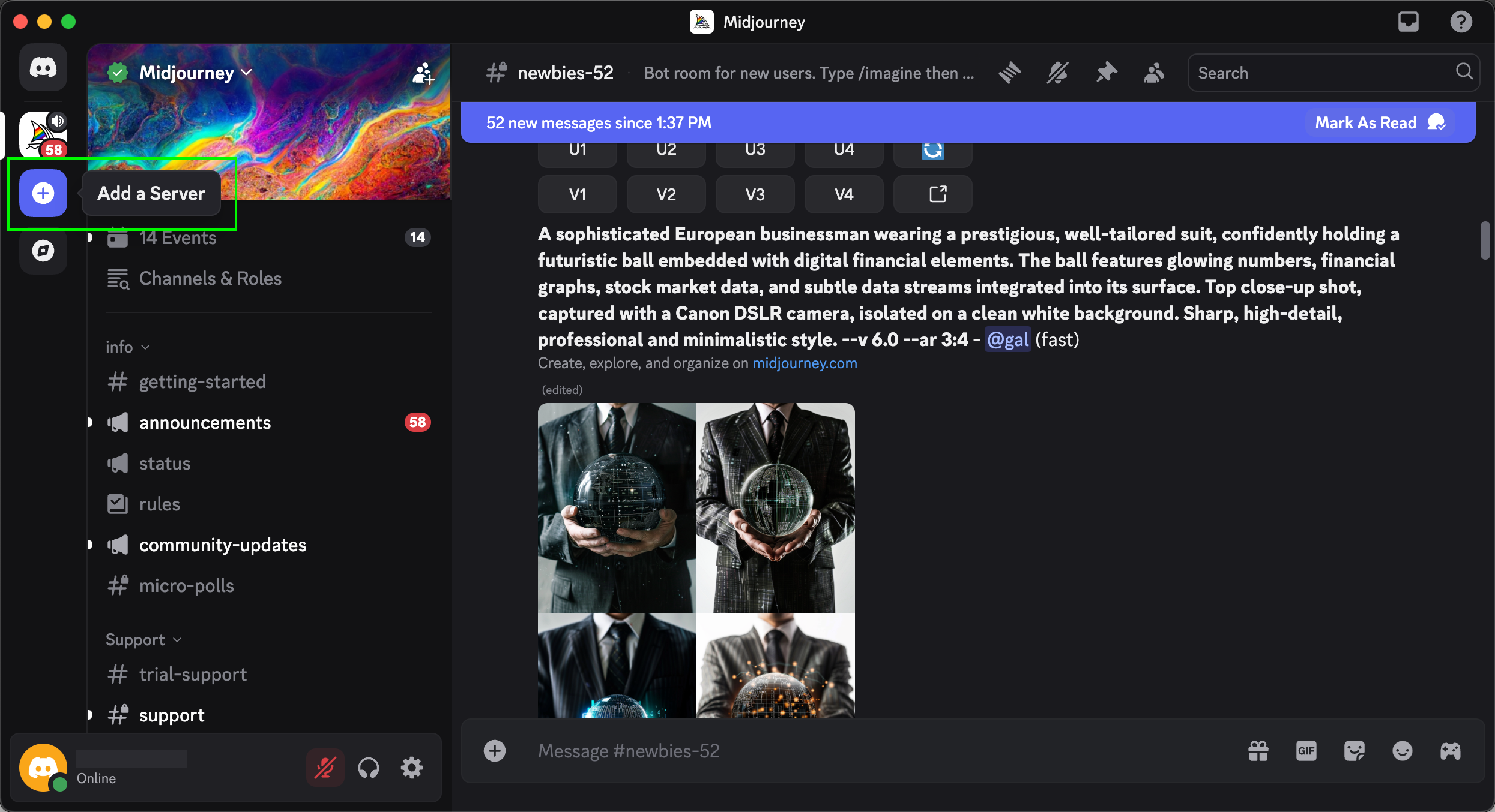 특히 공식 Midjourney 디스코드 서버에서는 내가 프롬프트를 입력할 때마다 수많은 유저들과 함께 작업하다 보니, 내 이미지 생성 과정이 전부 공개됩니다. 그럼 어떻게 해야 할까요? 바로 서버 추가를 통해 해결할 수 있습니다.