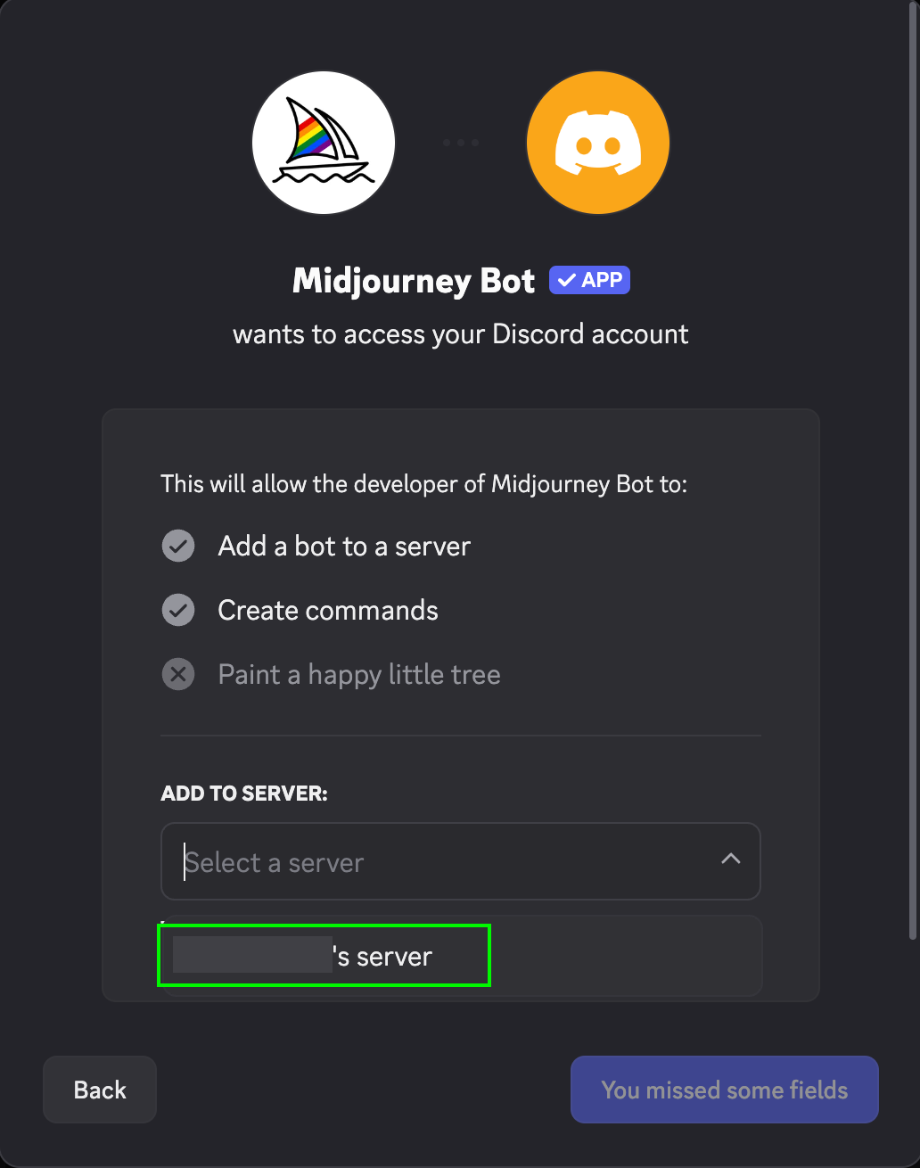 4. 이전에 생성한 나만의 서버를 드롭 메뉴에서 선택하여 미드저니 봇을 추가해 줍니다.