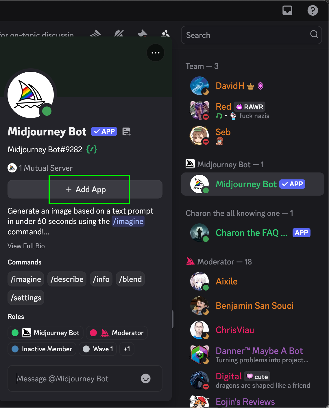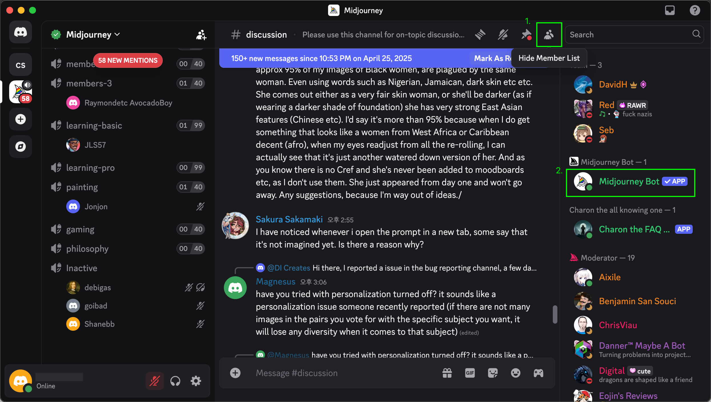 1. Midjourney 공식 서버에 접속합니다. 상단 메뉴 아이콘들 중 Hide Member List를 클릭해서 숨겨진 멤버들 중, Midjouney Bot을 찾아 클릭해 줍니다.