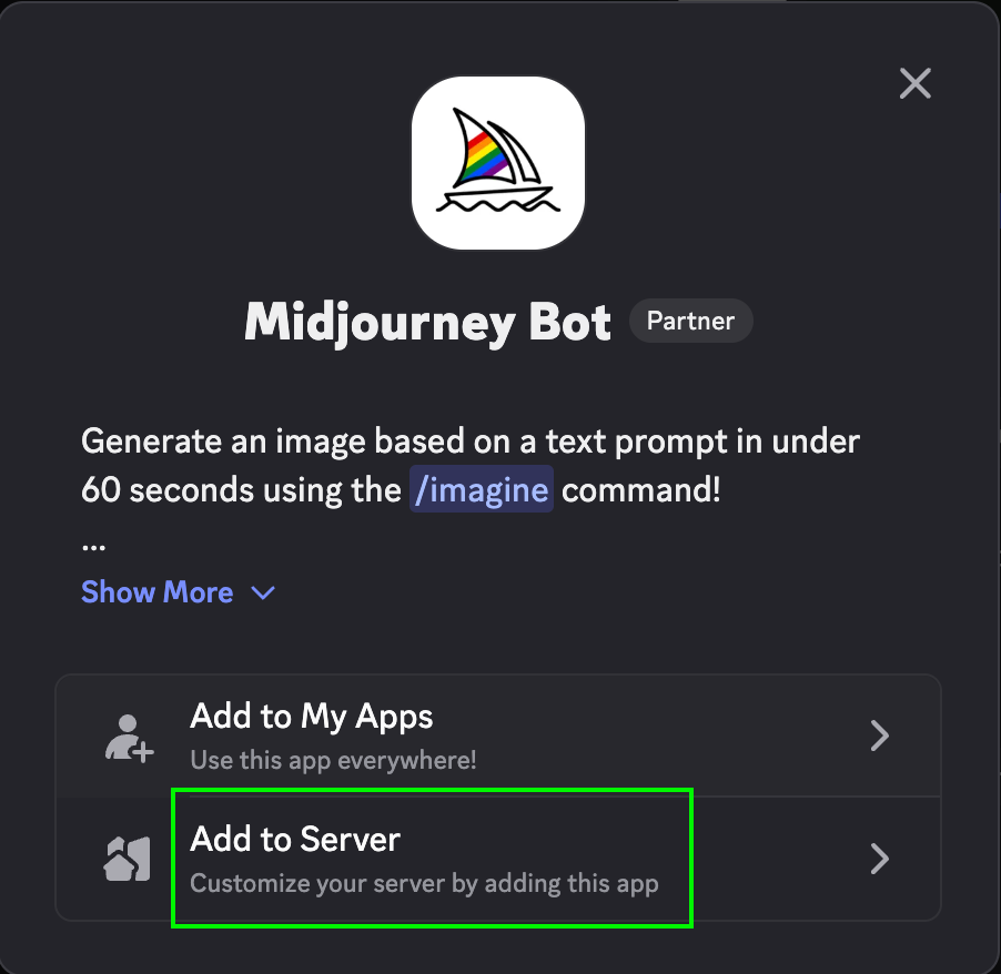 3. Add to Server를 클릭하여 내가 생성한 서버에 봇을 추가해 주세요.