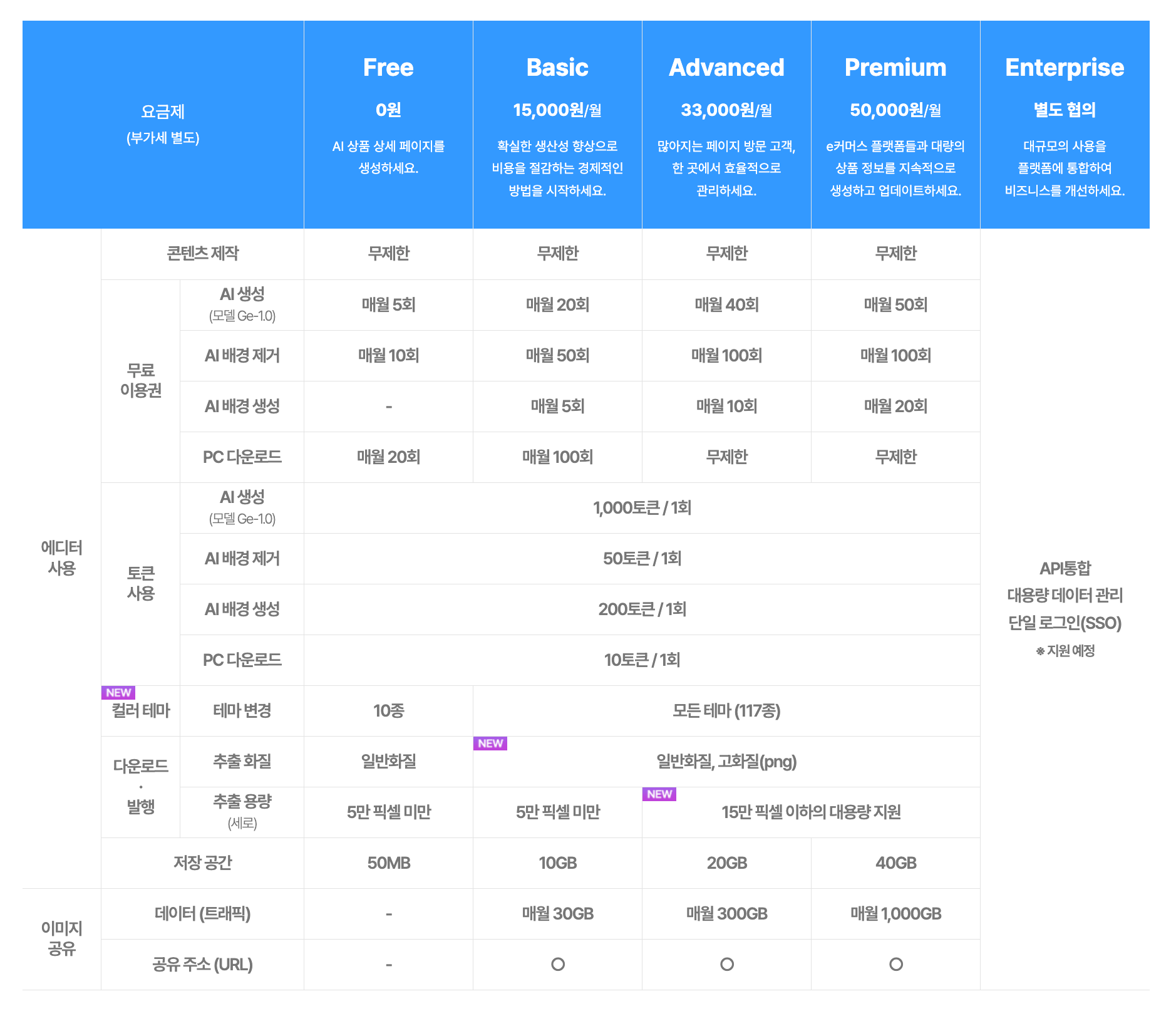 제디터 AI는 Free, Basic, Advanced, Premium, Enterprise 요금제를 제공합니다. 각 요금제별 혜택은 다음과 같습니다.