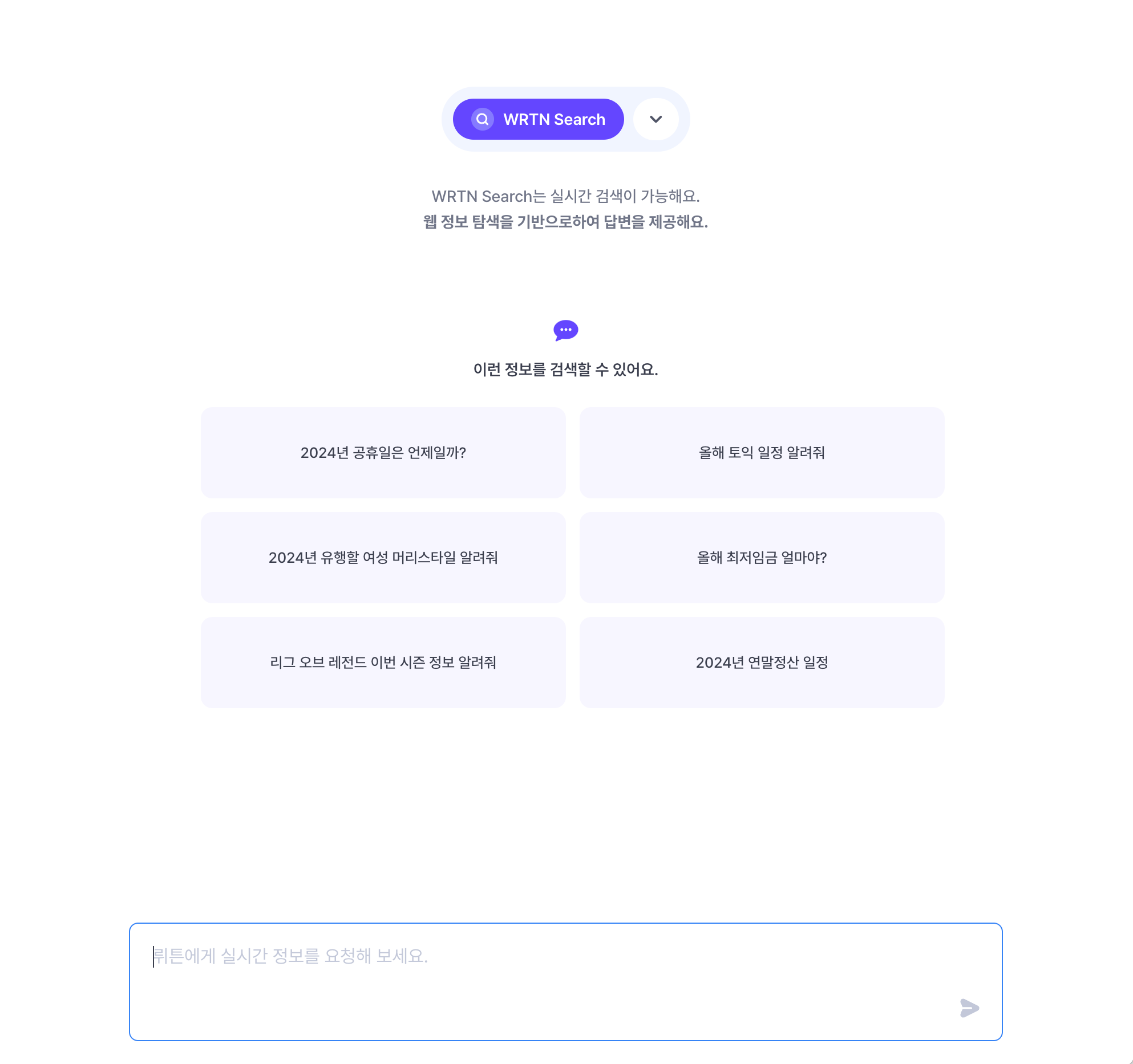 일반 모드에서는 2021년까지의 정보만 학습한 모델의 한계로 실시간 정보를 반영하지 못하는 문제가 있는데 실시간 정보가 필요한 상황에는 WRTN Search를 선택하여 검색해 보세요. 웹 정보 탐색을 기반으로 답변을 제공합니다.