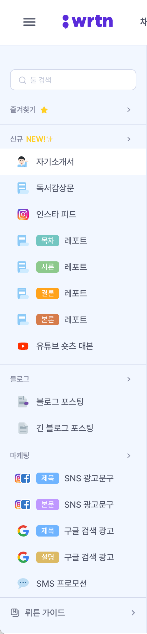 자기소개서, 면접 예상 질문, 독서감상문, 인스타 피드, 유튜브 숏츠 대본 등 글을 창작해서 써야하는 웬만한 형식들을 제공해주고 있습니다.