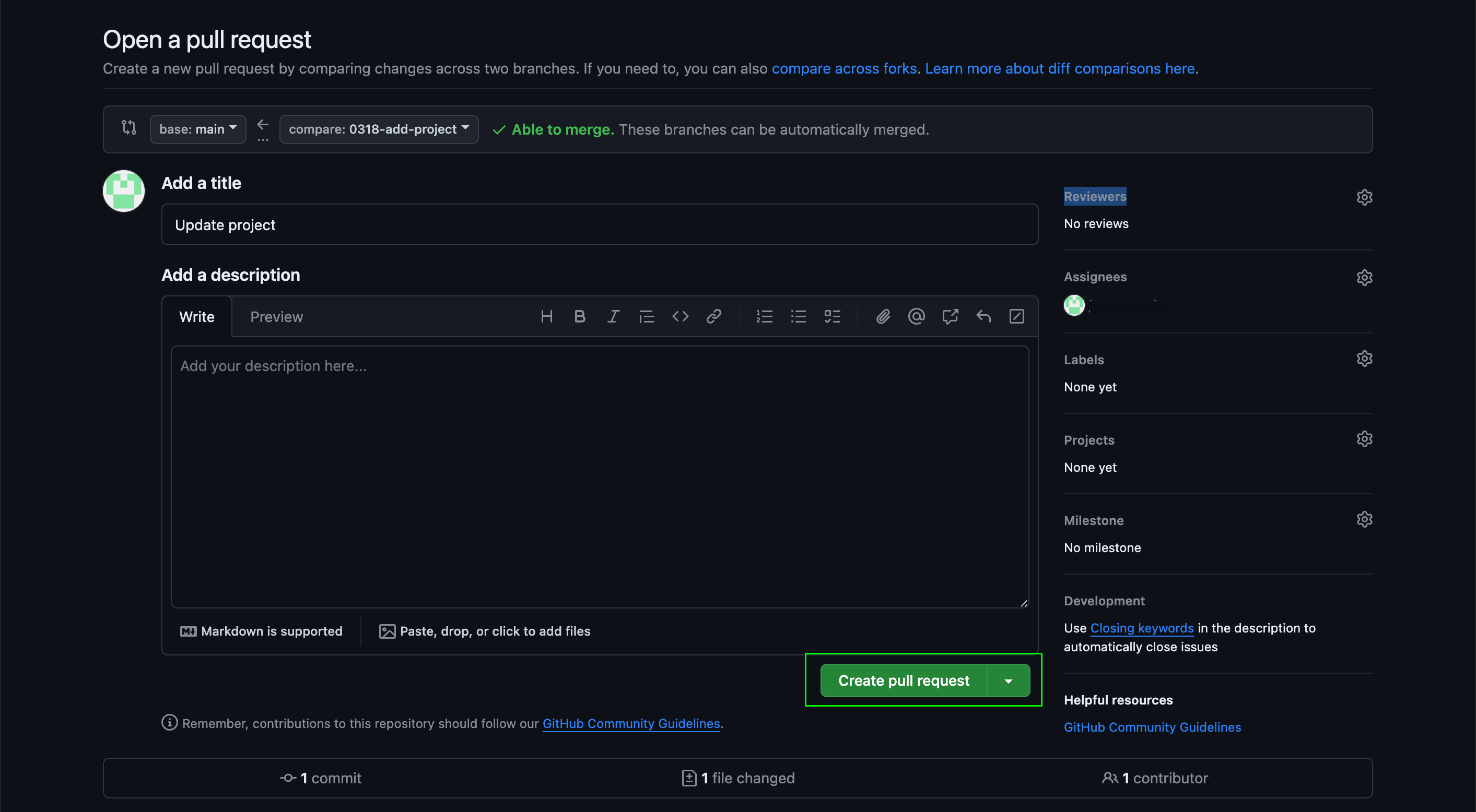한번 더 수정사항이 제대로 반영됐는지 확인을 완료한 후, Create pull request 버튼을 클릭하여 PR을 올립니다.
