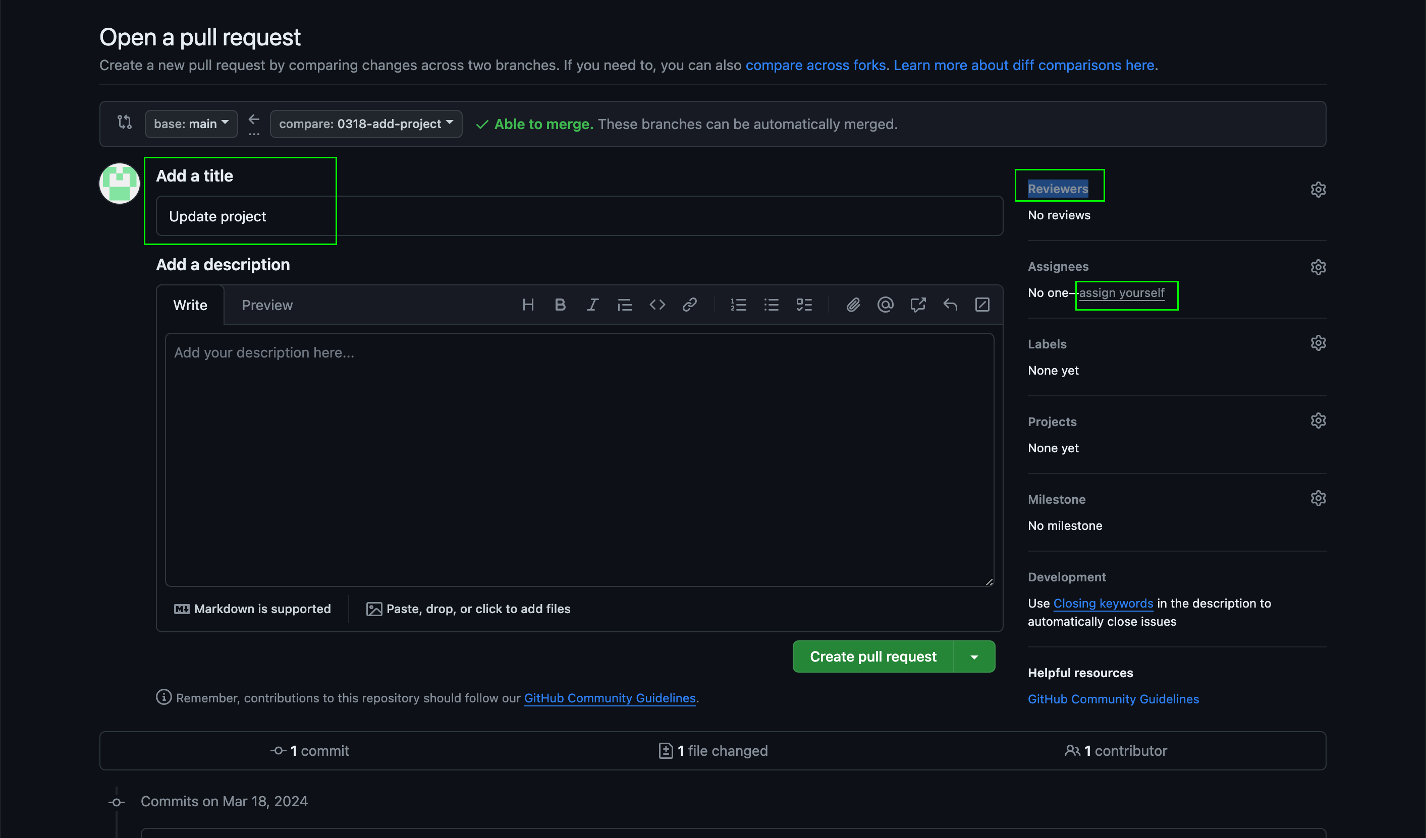 Reviewers(검토자)를 검색하셔서 선택하시고, Assigness(담당자)는 assign yourself를 클릭하시면 됩니다.