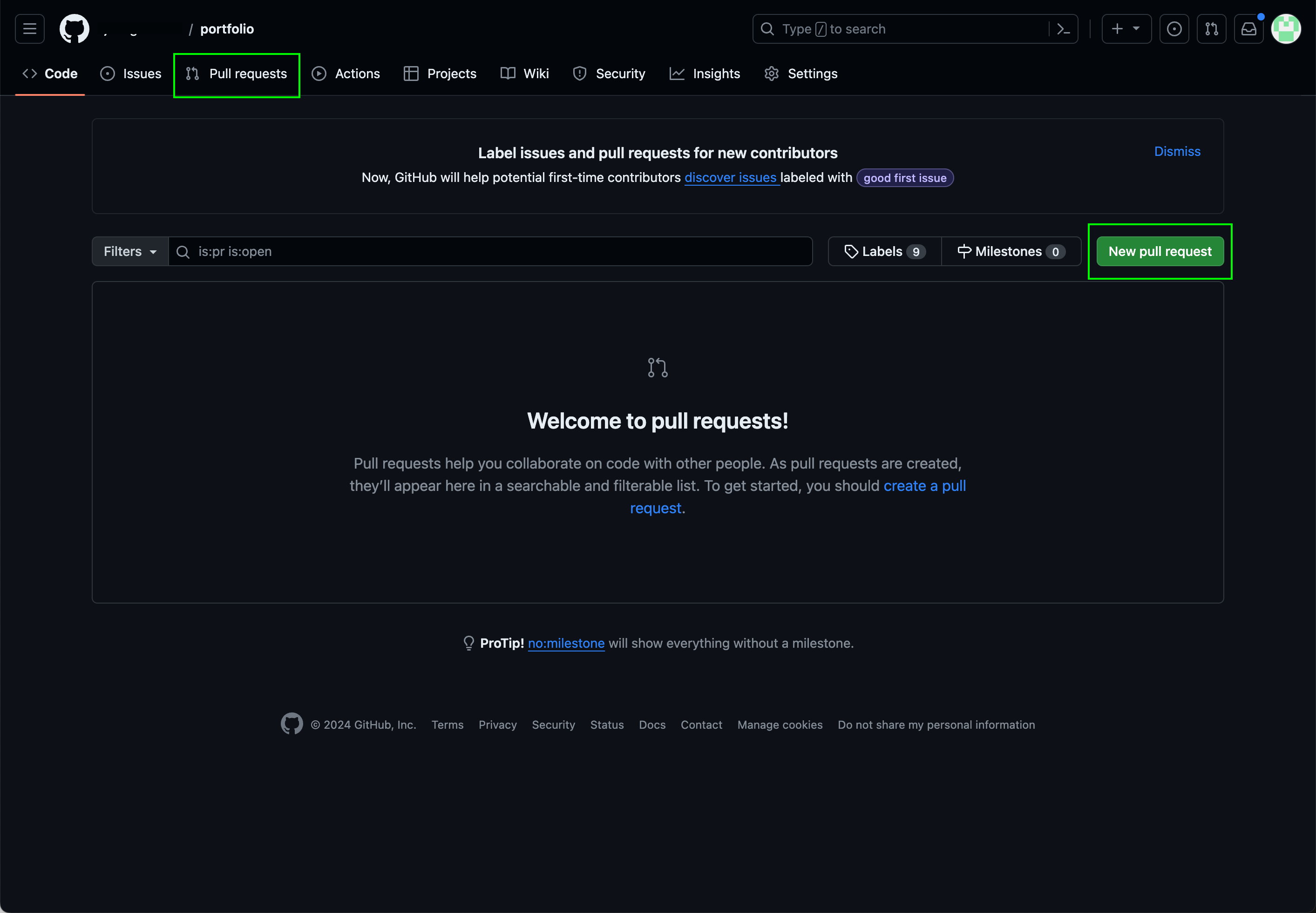 New pull request 버튼을 클릭하여 새로운 PR을 생성합니다.