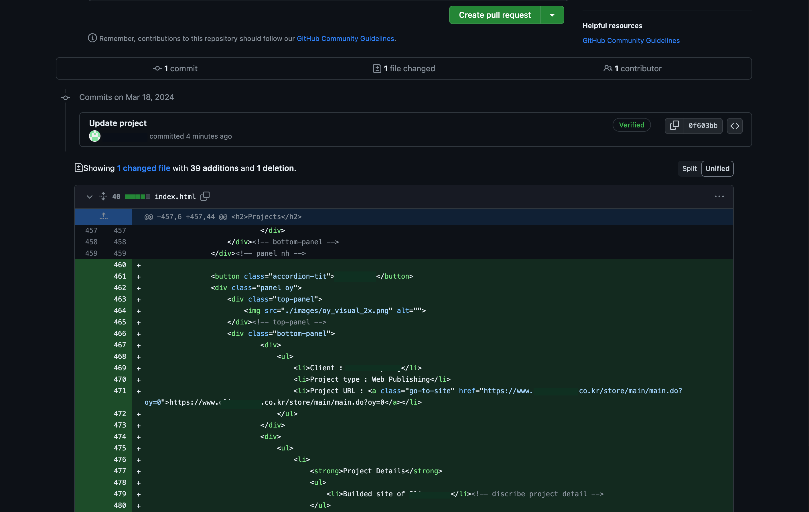 Create pull request 버튼을 클릭하기 전에 하단으로 스크롤하시면 변경 이력이 보입니다.