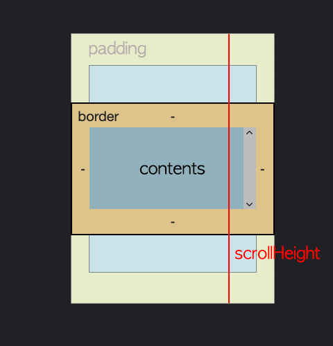 해당 요소의 콘텐츠(contents)가 모두 보이기 위해 서로 스크롤이 필요한 영역의 크기를 반환합니다. 스타일(CSS)로 overflow: hidden; 으로 화면에 표시되지 않는 영역까지 포함하여 높이값을 반환합니다.