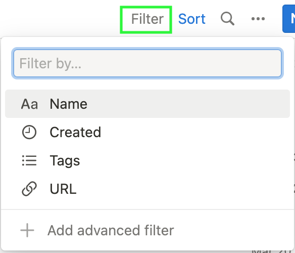 - Filter 버튼을 클릭하시면 이름, 생성된 날짜, 태그, URL 별로 필터링하실 수 있습니다.