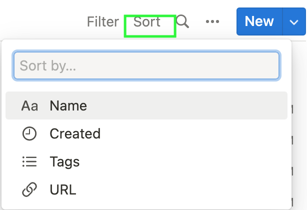 - Sort 버튼을 클릭하시면 이름, 생성된 날짜, 태그, URL 별로 분류하실 수 있습니다.