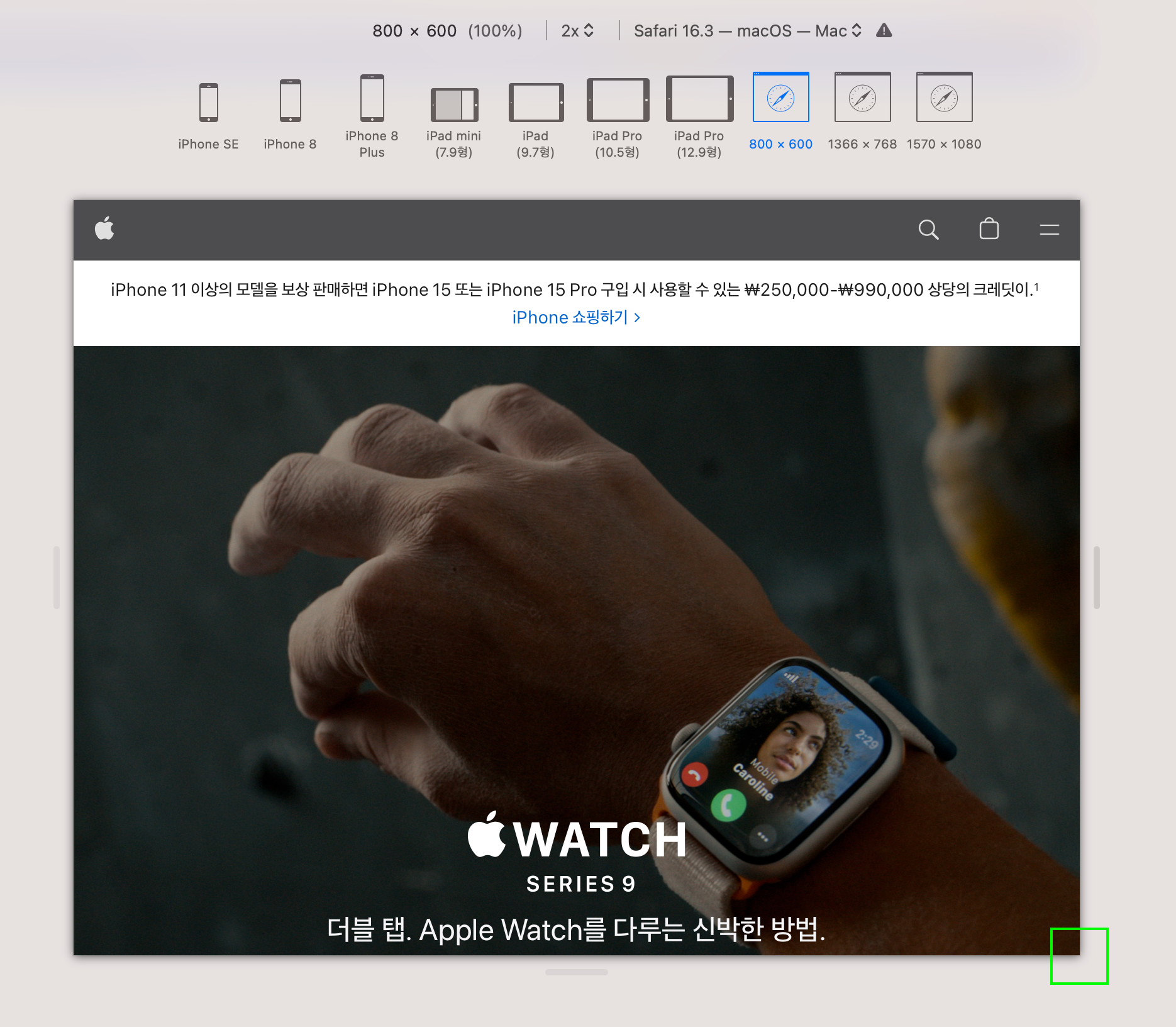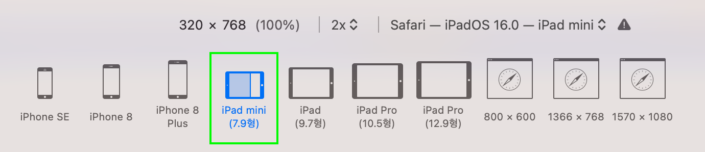 제공된 디바이스 크기 외에 반응형 모드로 접근하고 싶다면, 우측에 웹페이지 아이콘을 클릭하여 화면의 가장자리를 마우스로 드래그하여 해상도 크기를 조절해 보세요.