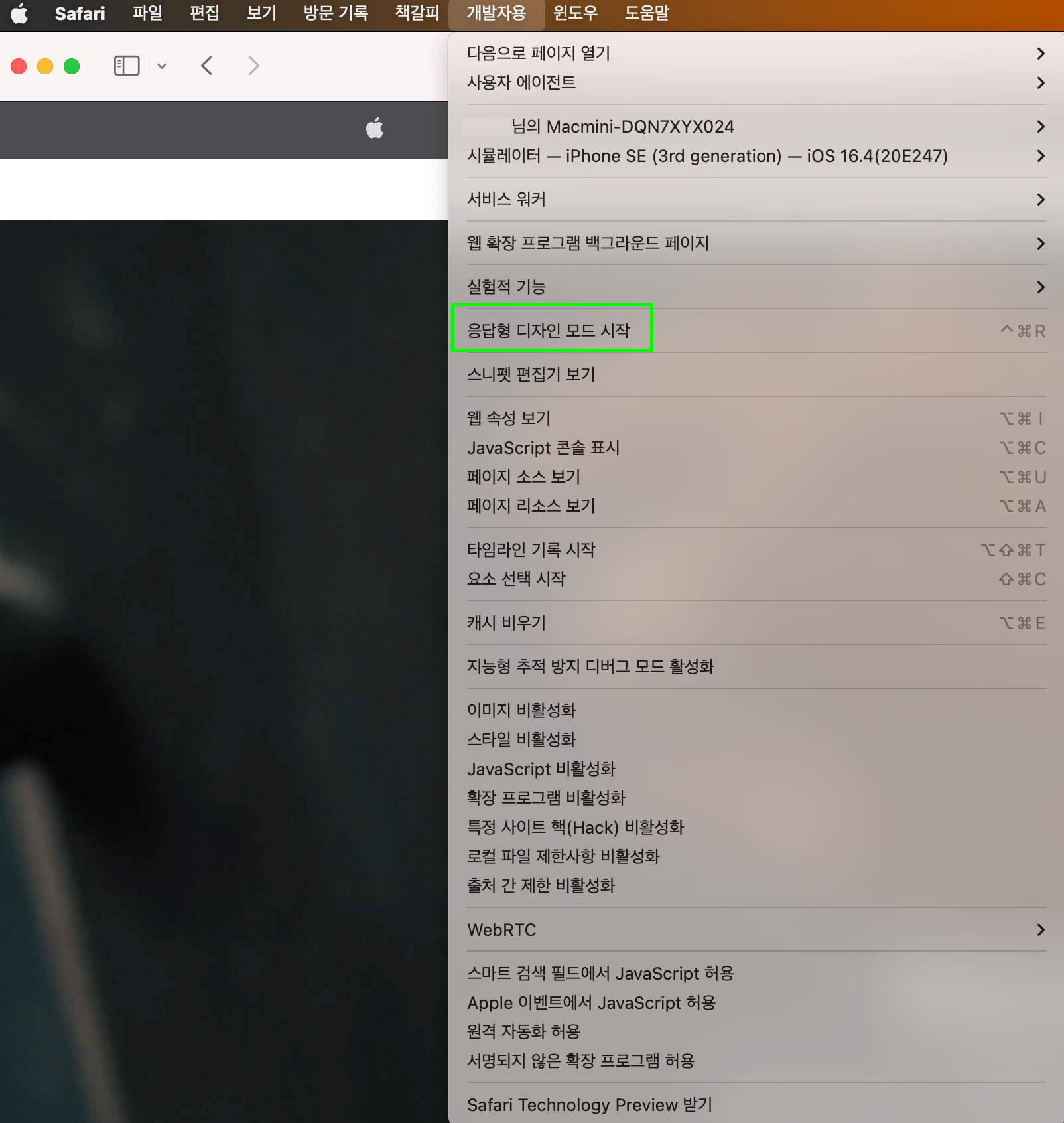 반응형 모드를 빠져나오려면 상단 메뉴에서 개발자용 > 응답형 디자인 모드 종료를 클릭하거나, 단축키 control + cmd + R 누르시면 됩니다.
