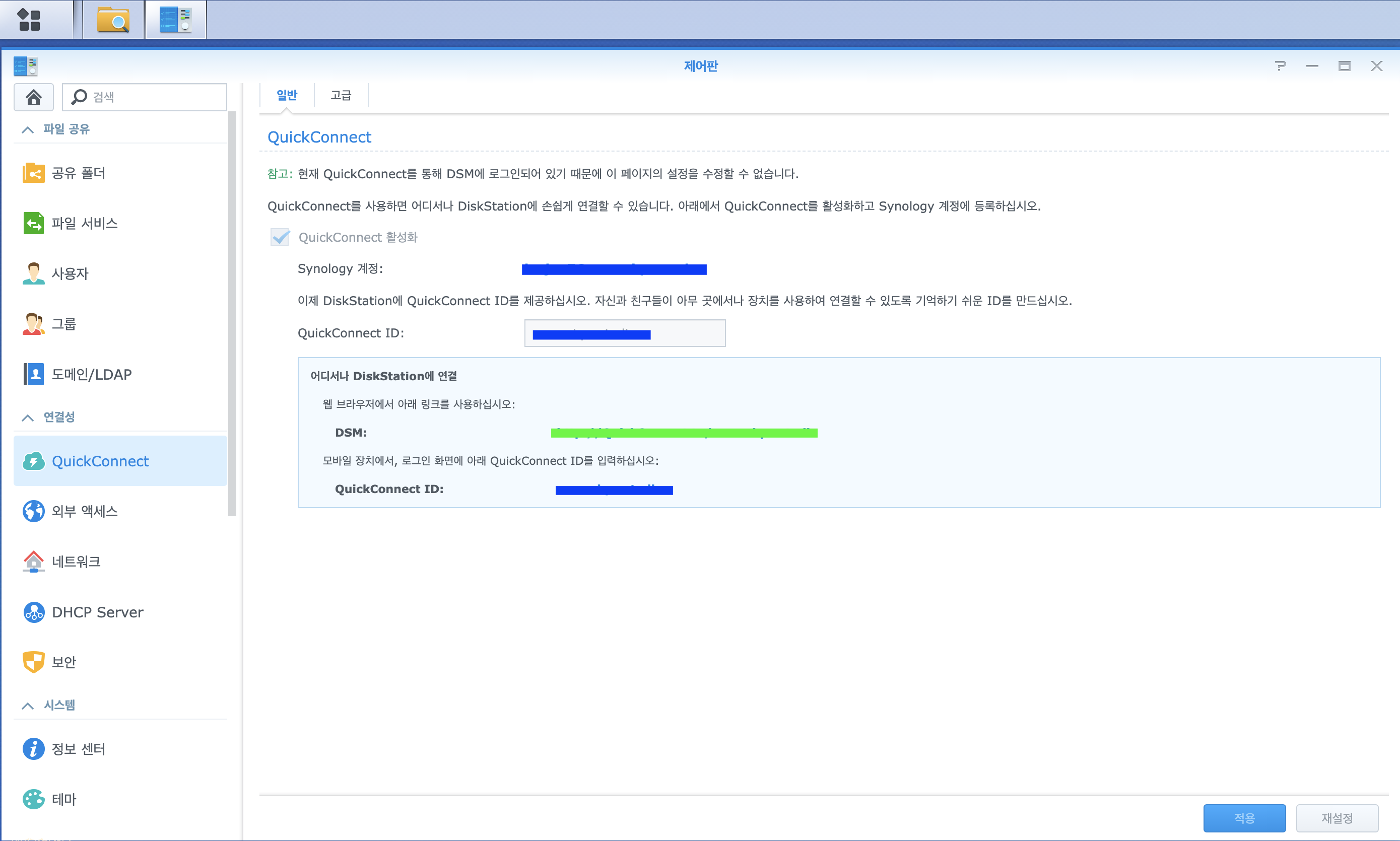 제어판에 들어가시면 QuickConnect 메뉴에서 Synology 계정 정보를 확인 및 설정하실 수도 있습니다.