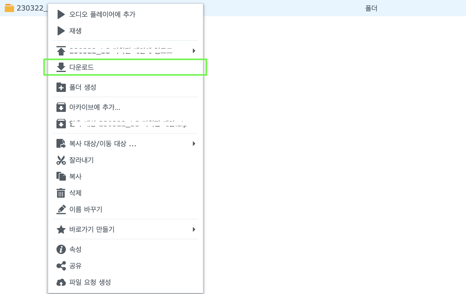 파일 확인하셔서 마우스 우클릭 > 다운로드 클릭하시면 로컬 PC에 다운로드 처리됩니다.