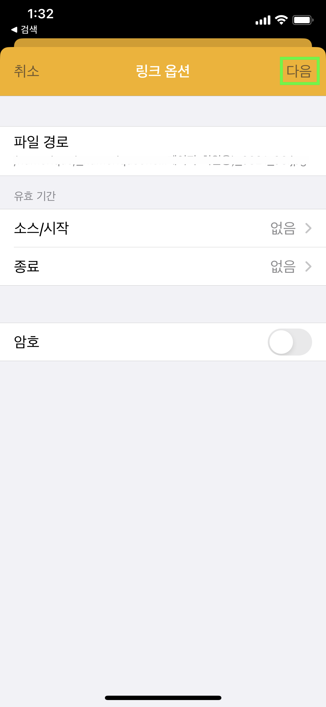 또 옵션으로 유효기간 및 암호를 설정해서 조금 더 보안적으로 안전하게 파일을 공유할 수도 있습니다!