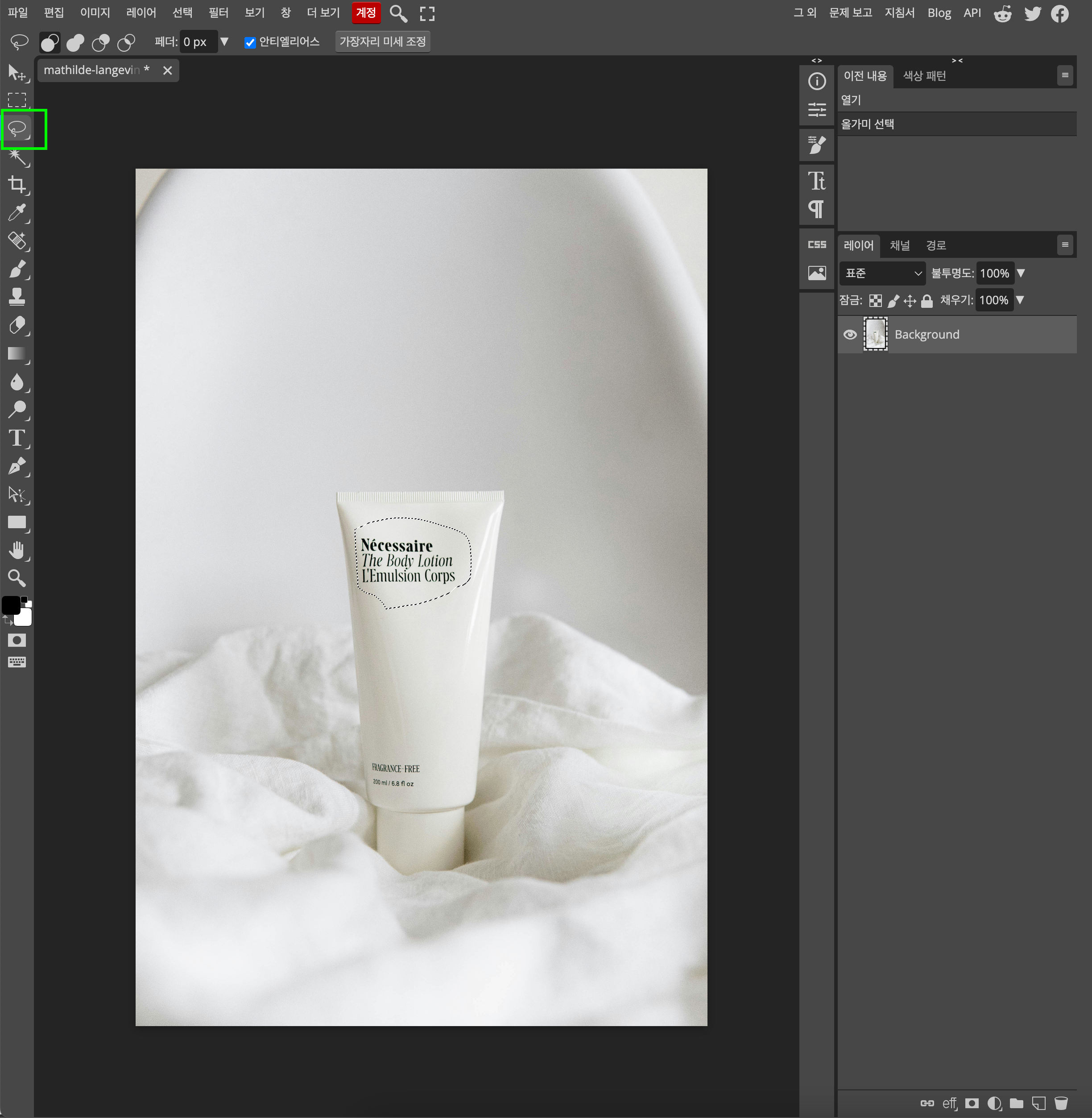 이미지에 편집하려는 부분을 올가미 선택 도구를 사용하여 원하는 영역을 선택합니다. 일반적으로 이것은 제거하려는 객체 또는 배경을 포함하는 영역입니다.