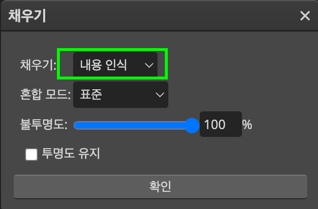 채우기 드롭 메뉴에서 내용 인식(Content-Aware)을 선택하시고 확인을 클릭하세요.