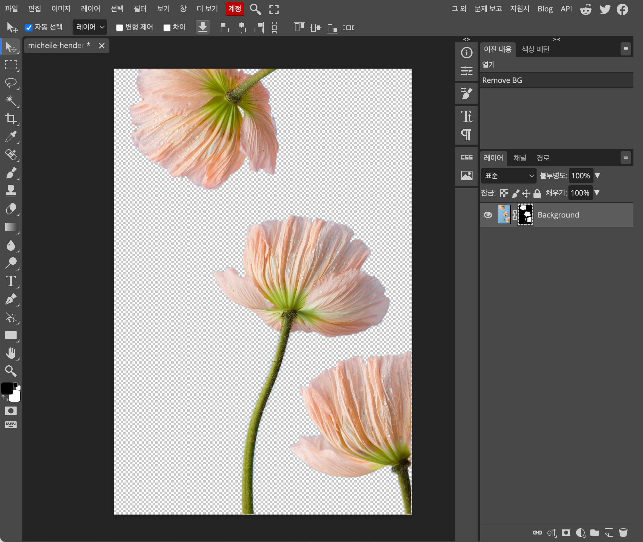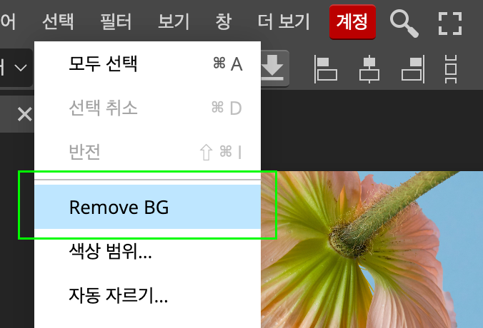 상단 메뉴바에서 선택 > Remove BG를 클릭하세요.