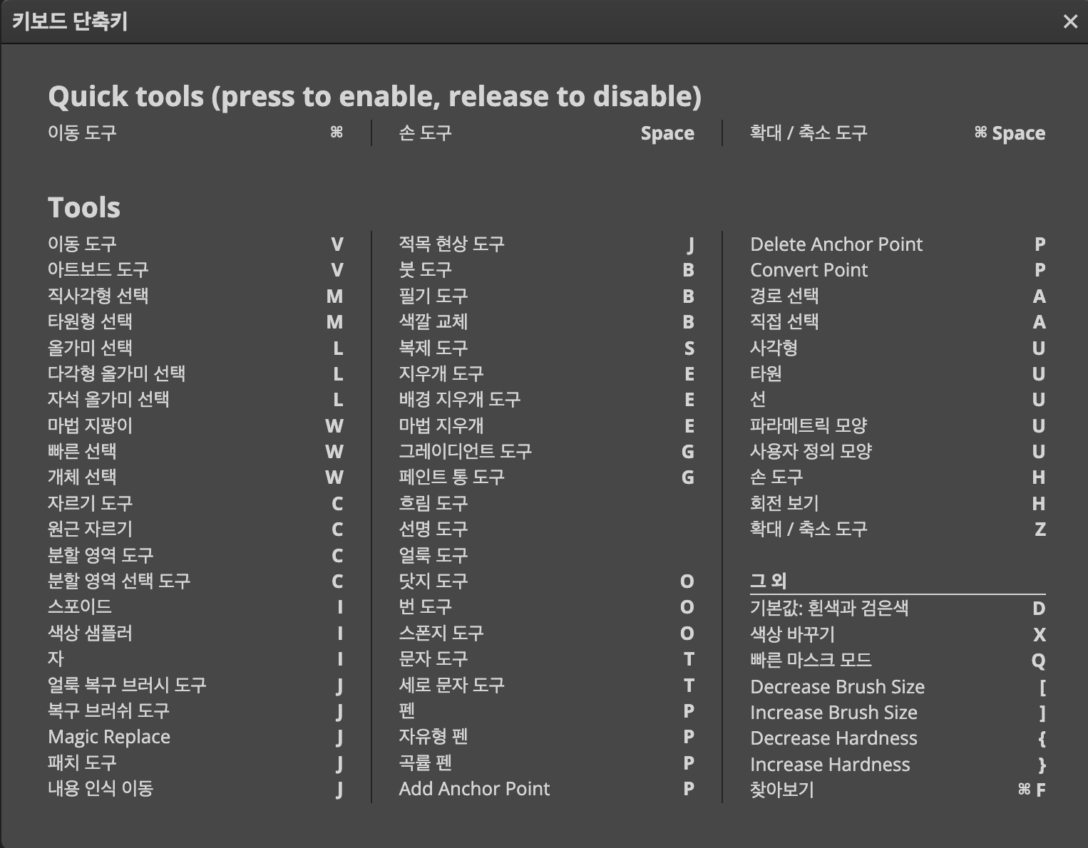 아래의 이미지를 참고하여 키보드 단축키를 활용하여 작업의 효율을 높여보세요.