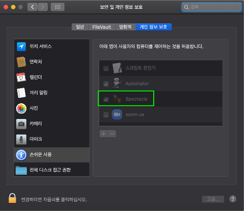 보안 및 개인 정보 보호 > 손쉬운 사용 > Spectacle 제어 허용