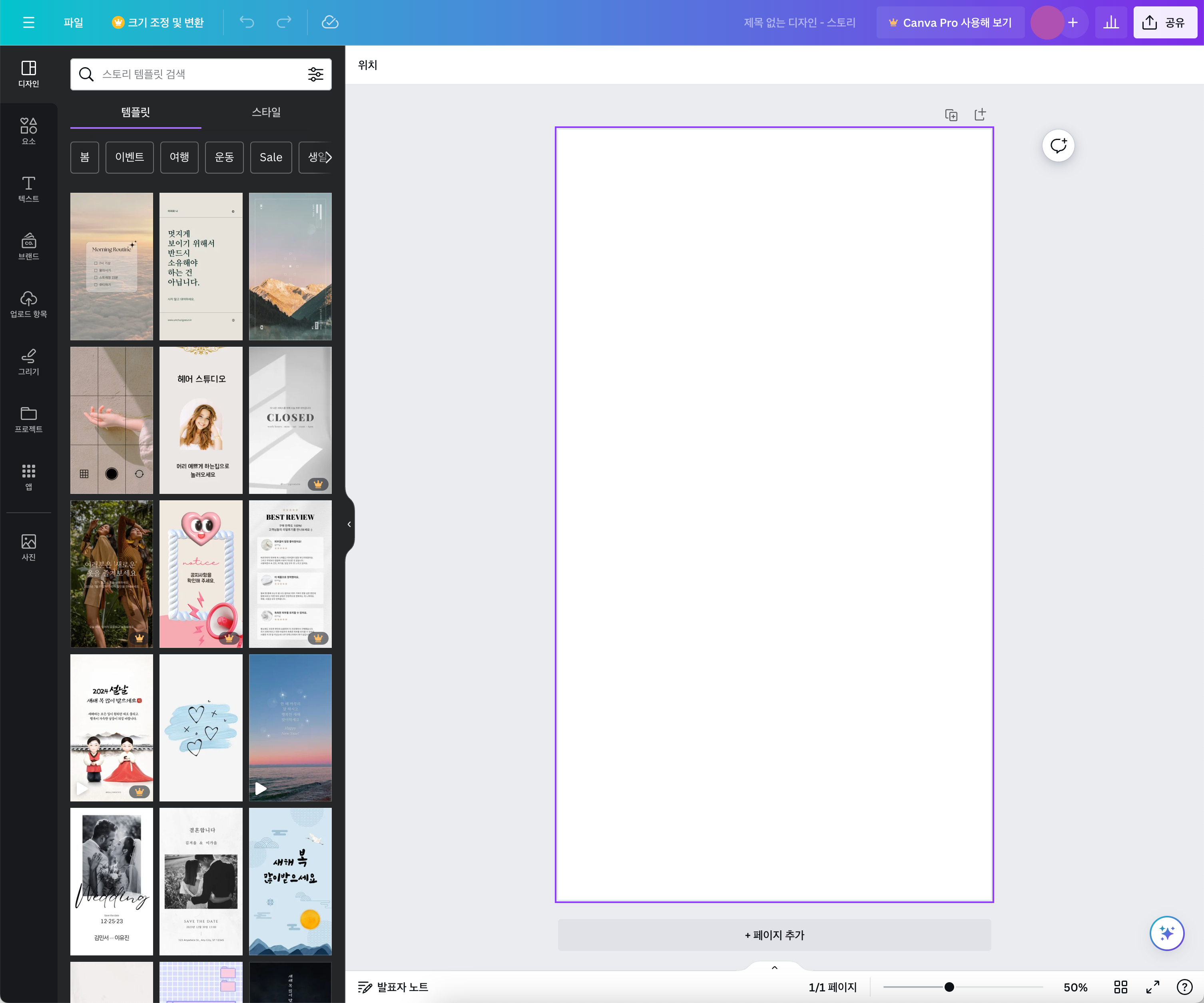 좌측 메뉴 탭에서 인스타 스토리의 다양한 템플릿이 제공되는 것을 확인하실 수 있습니다.