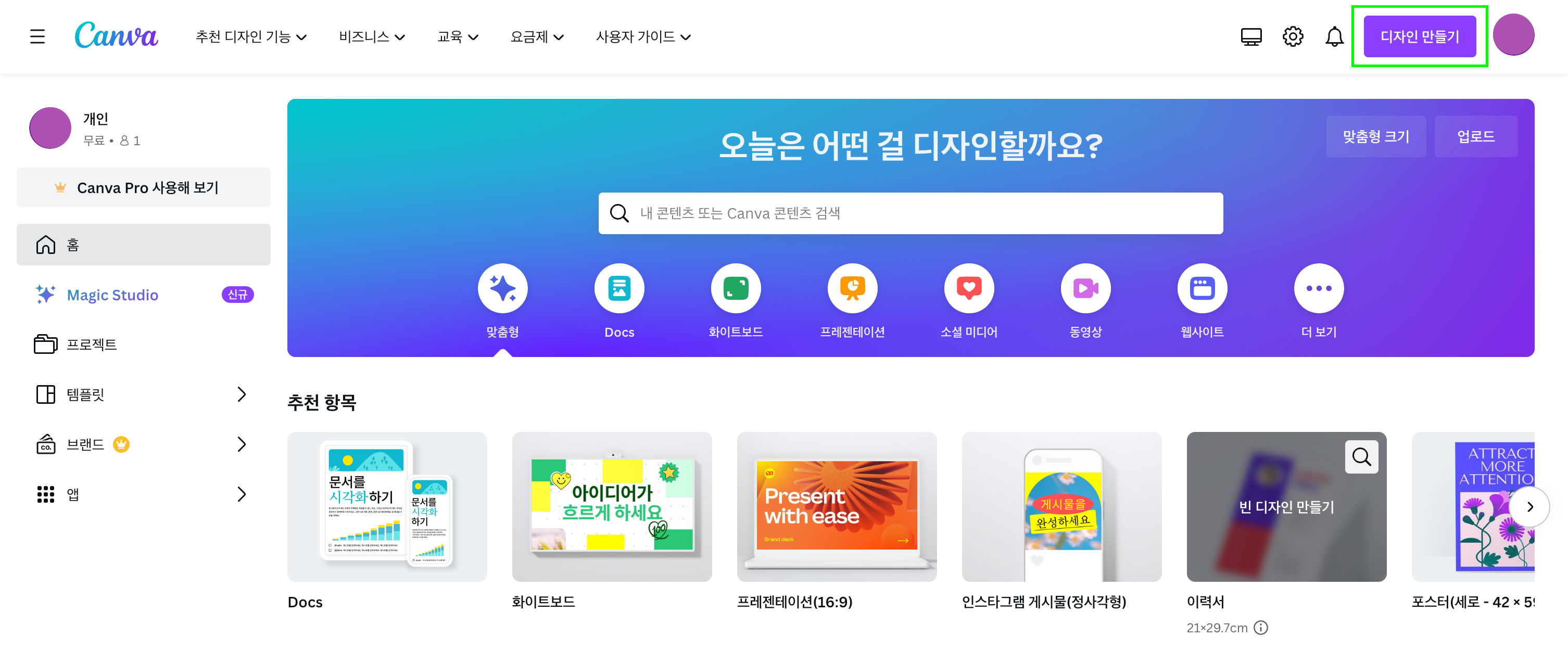 로그인 후, 우측 상단에 디자인 만들기 버튼을 클릭하세요.