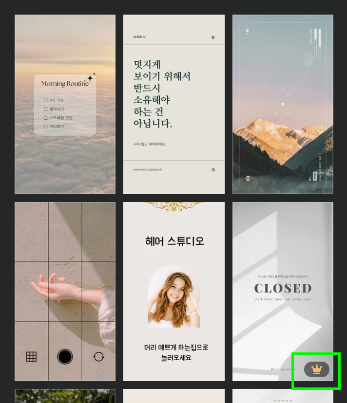 유료 버전인 경우는 유료 아이콘을 통해 구별하실 수 있습니다. 워낙 템플릿 종류도 다양하고 템플릿을 선택하고 자기 취향에 맞게 커스텀화 할 수 있기 때문에 굳이 유료 버전까지는 사용하실 필요 없을 것 같아요.