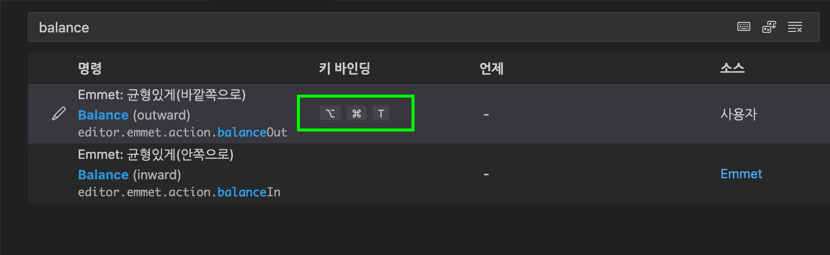 balaceOut으로 검색해 보세요. 그리고 원하는 키를 조합하여 설정해 줍니다.