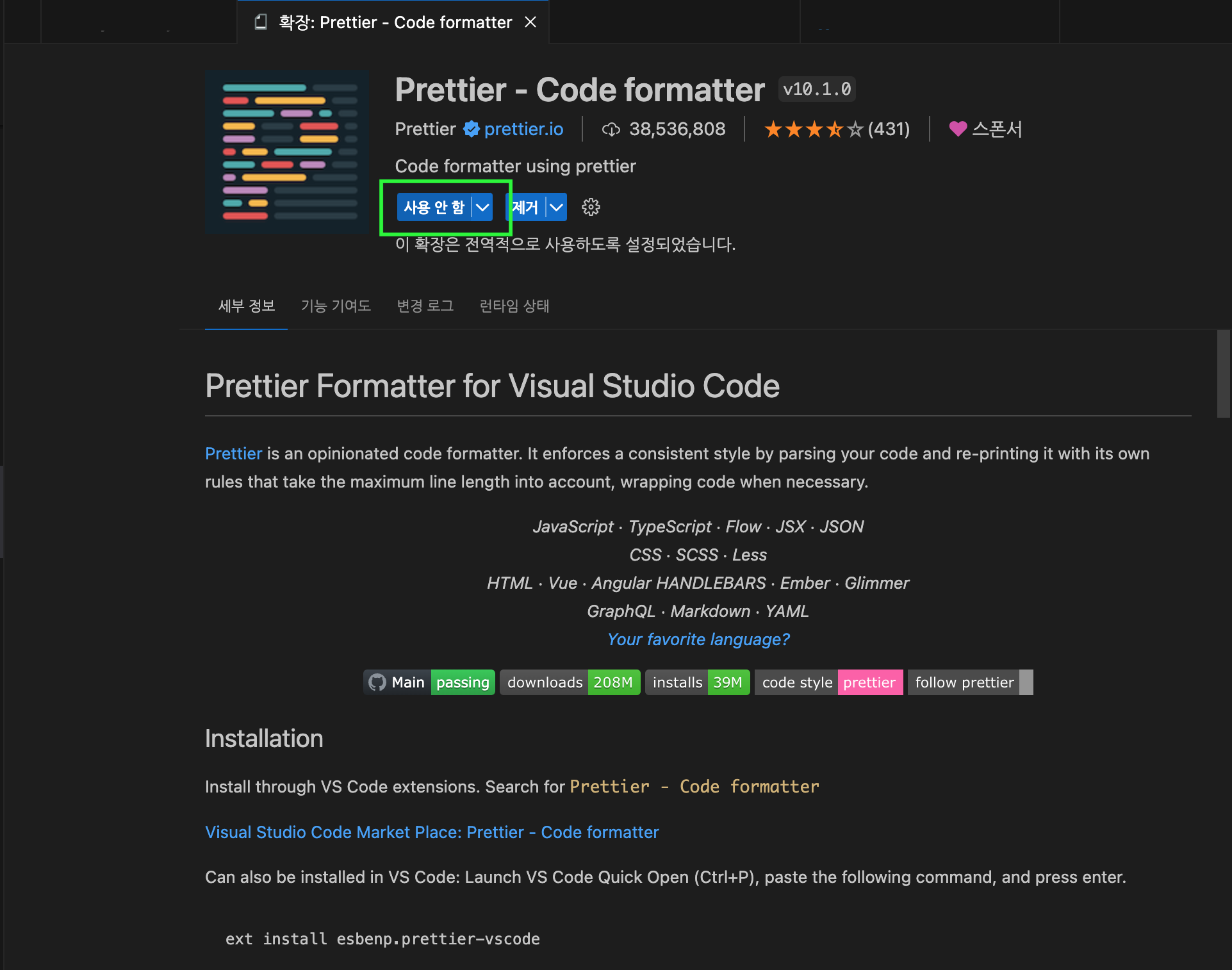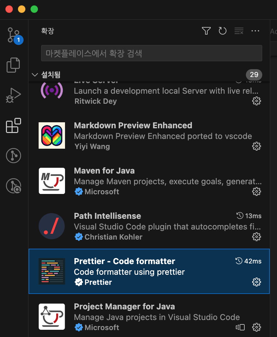 VS Code > 마켓플레이스에서 Prettier 검색 > install 클릭으로 간단하게 설치할 수 있습니다.
