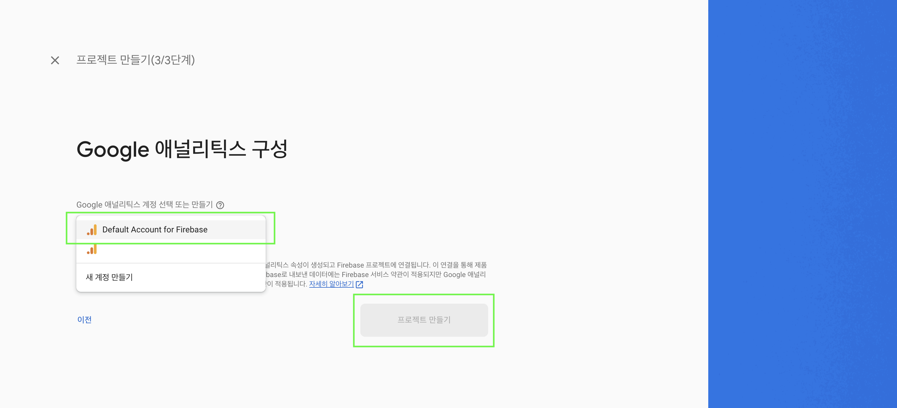 저는 애널리틱스 계정이 하나 더 있어서 리스트에 뜨는데, Default Account for Firebase를 선택해 주시고 프로젝트 만들기 버튼을 클릭하시면 됩니다.