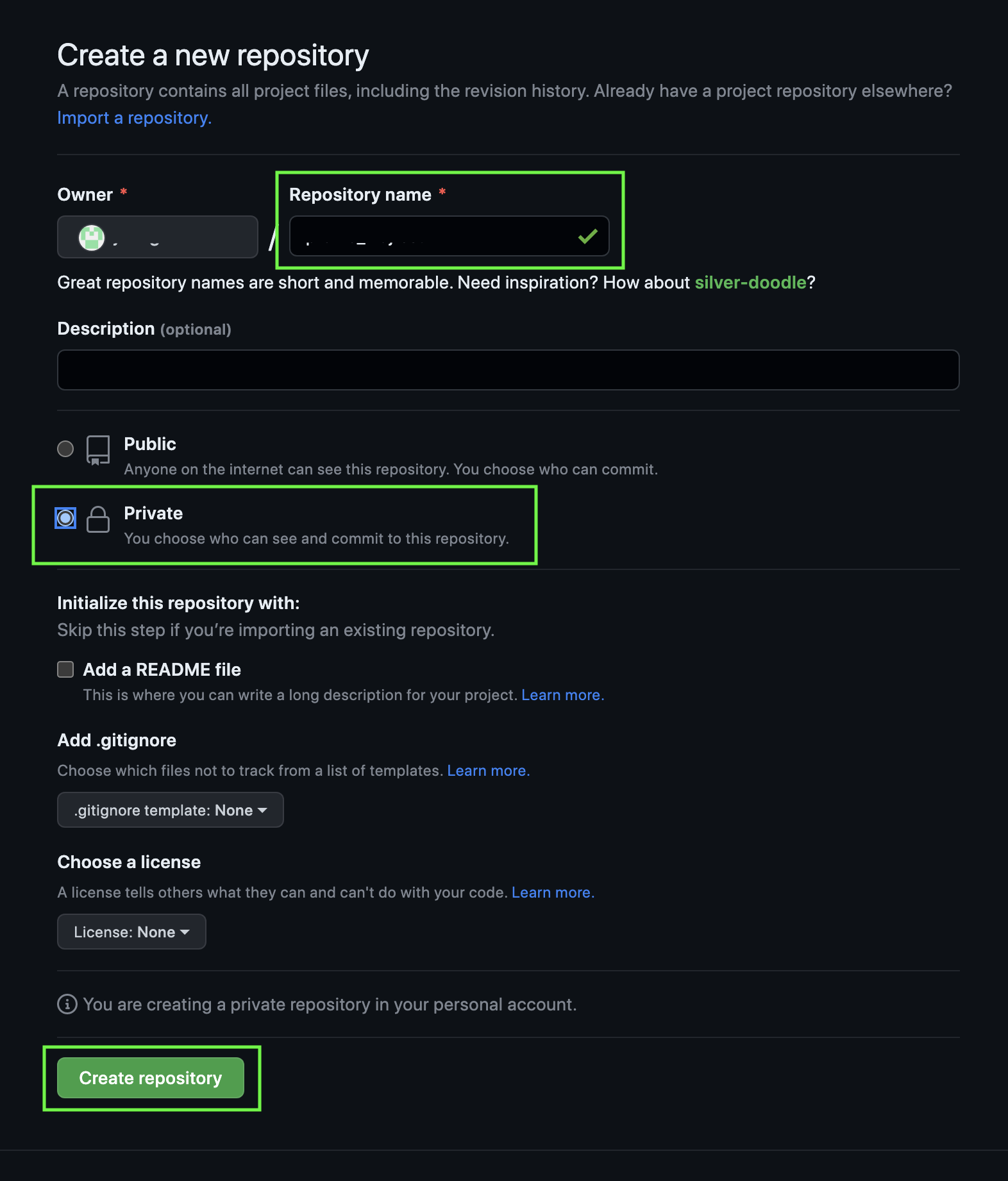 Repository name* : 저장소 이름을 설정해 줍니다.