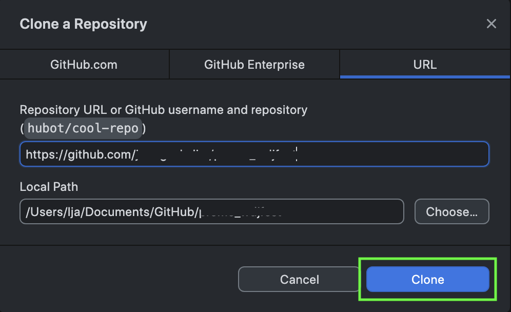 3. 로컬 경로(Local Path)를 확인하고, Clone 버튼을 클릭합니다.