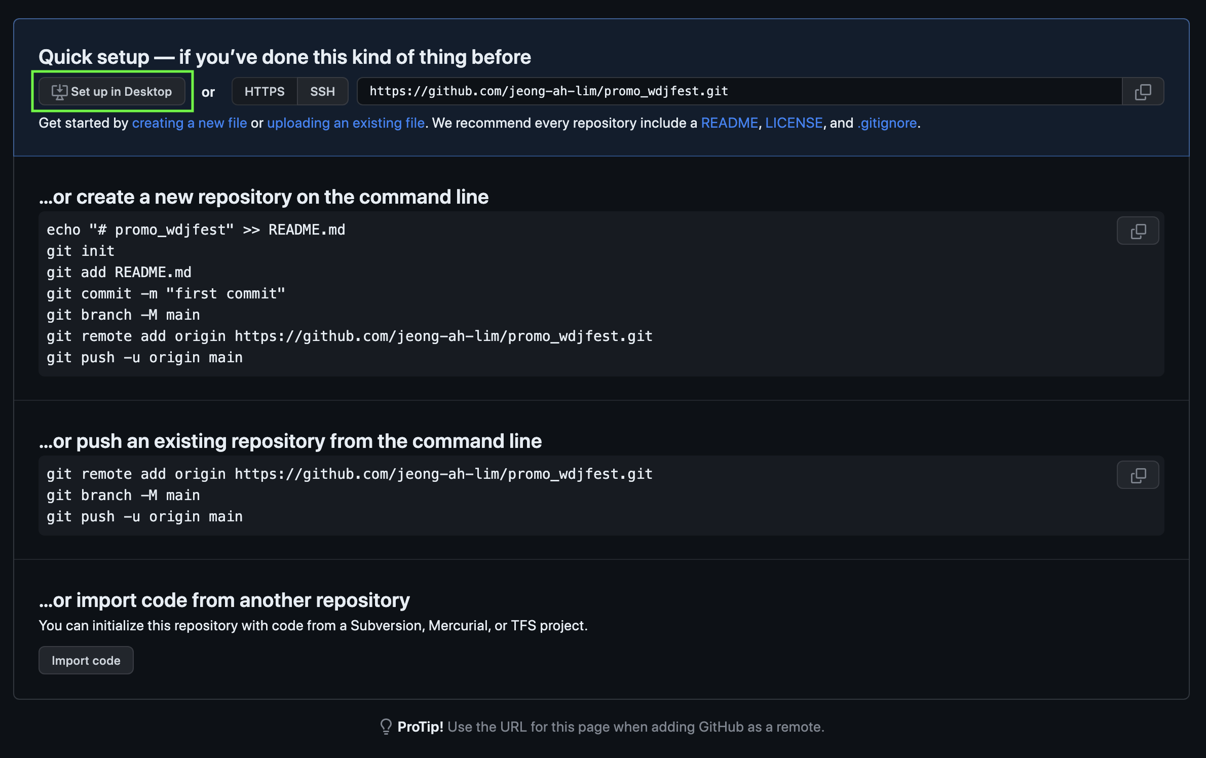 명령어(Command Line)로 저장소를 복제해도 되지만, Github Desktop을 설치하셨다면 아주 간단히 로컬에 저장소를 클론 하실 수 있습니다. Set up in Desktop을 클릭하세요.