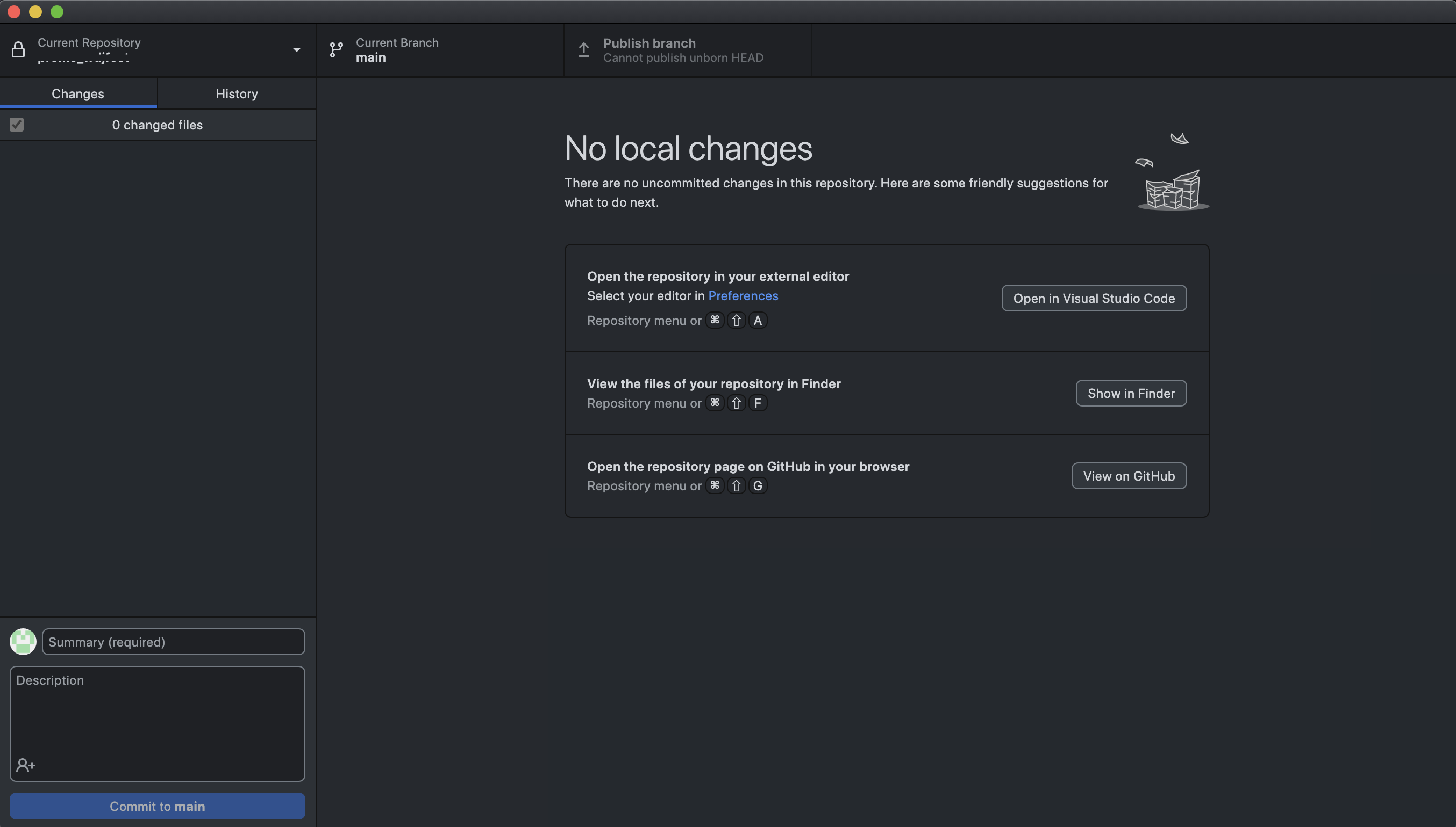 4. Github Desktop GUI가 등장합니다. 현재 저장소(Current Repository)가 제대로 연동됐는지 확인해서 이상 없으면 로컬에 복제(clone)가 된 겁니다.