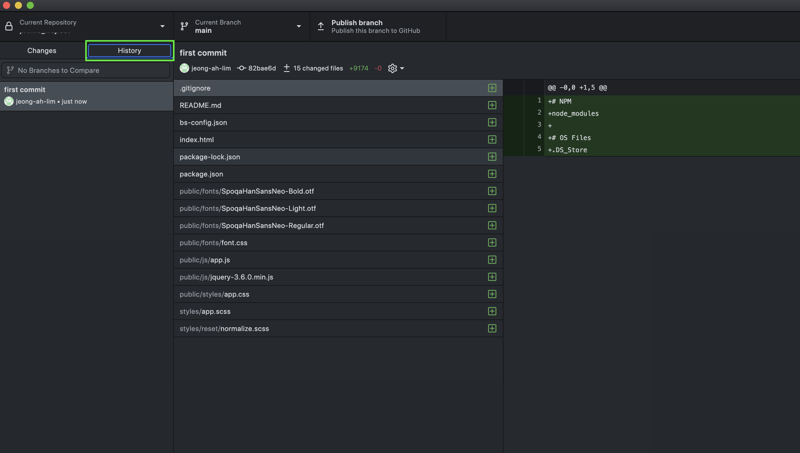 Publish branch를 클릭하면, 서버에 있는 저장소(Repository)에 변경 사항들이 업로드가 됩니다.