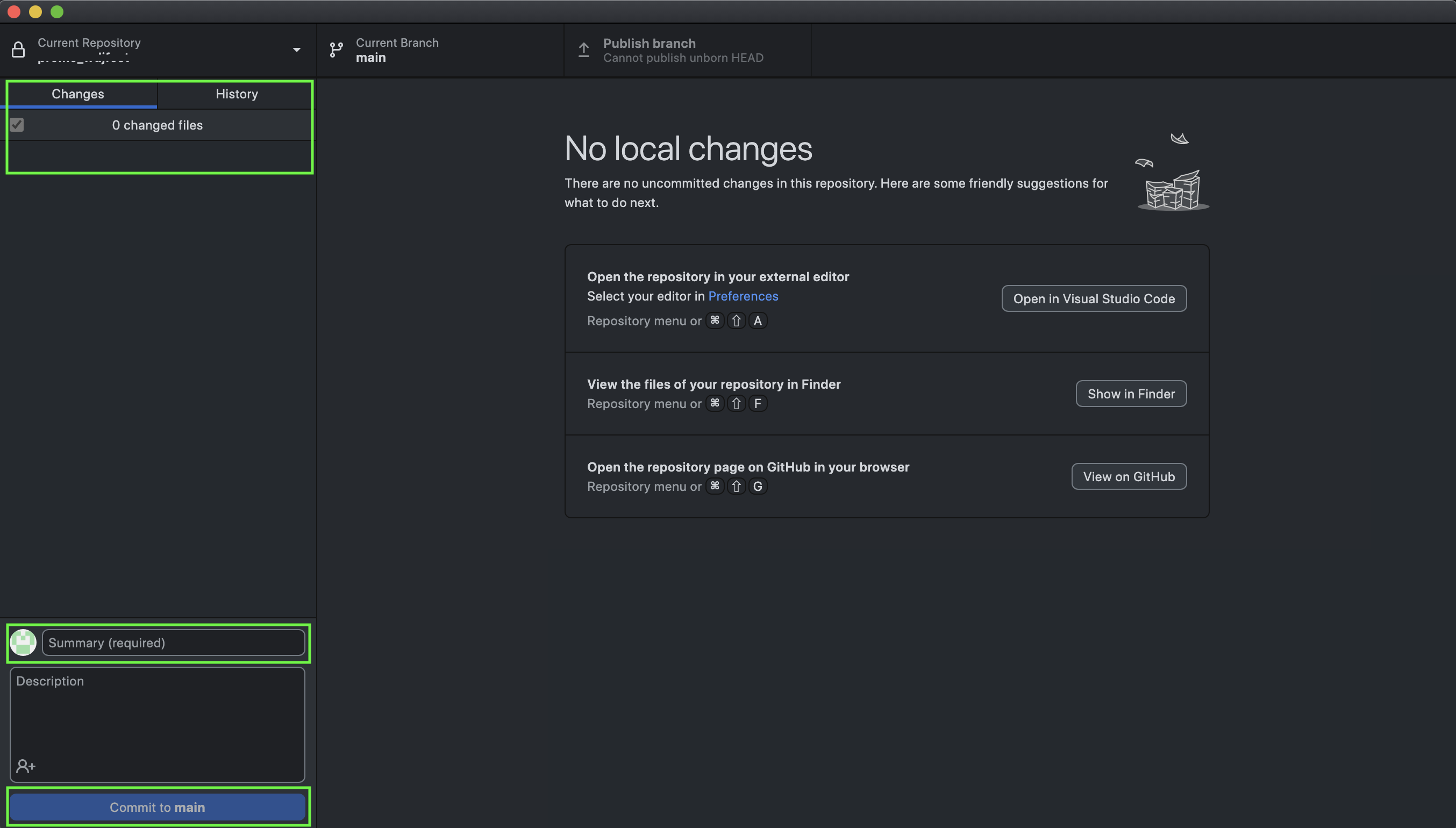 1. Changes 탭을 보면 변경 사항들이 뜹니다. 커밋 설명(Summary)하고 Commit to main 버튼을 클릭합니다.
