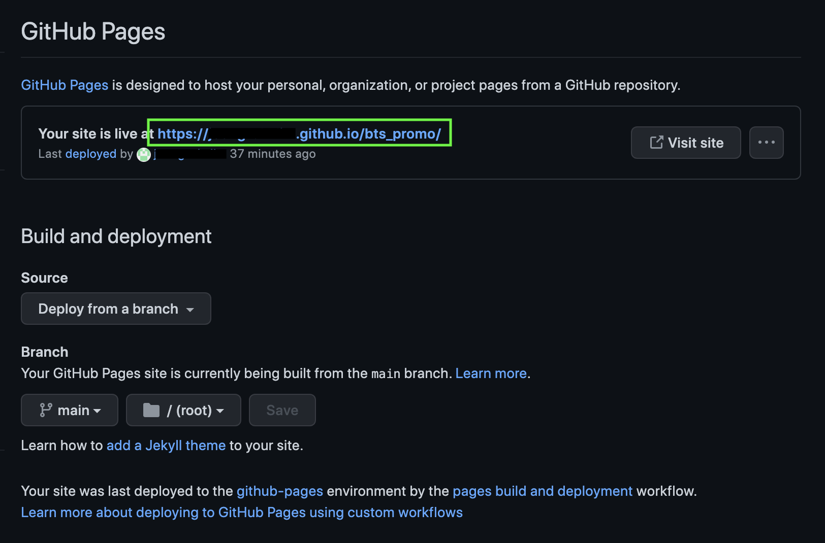 Build and deployment > Branch > None을 main으로 Save 해줍니다.